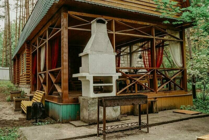 Перед входом терраса со скамейками и столами для застолья на воздухе, печка-барбекю.