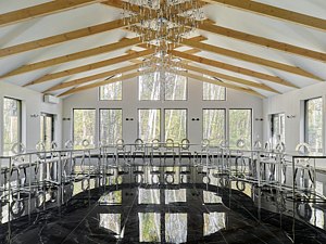 Аренда включает зал с банкетной расстановкой (выбор между шестью круглыми столами или тринадцатью зеркальными, пятьдесят стульев), три гостевых туалета, санузел и комнату для персонала, гримерную, гардероб, мангальную зону и уличную террасу у озера для выездной регистрации.