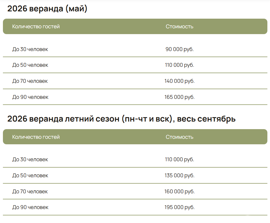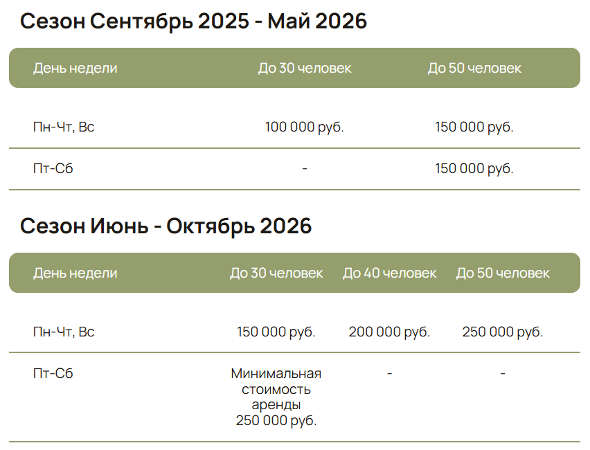 8. При проведении мероприятий (свадьбы, юбилеи, корпоративы) все активности за пределами арендованного объекта и тайминг мероприятия согласовываются с администратором заранее.