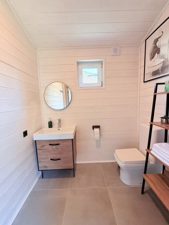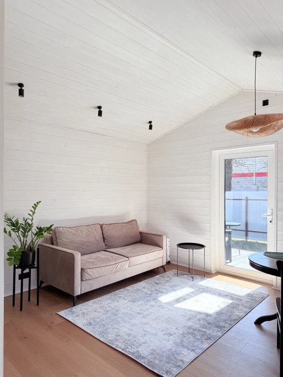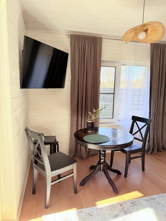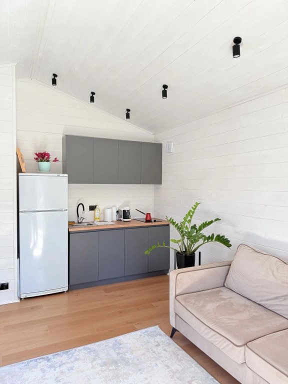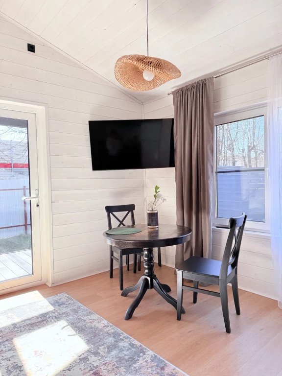Двухкомнатный дом рассчитан на размещение до четырёх гостей. В наличии двуспальная кровать с постельным бельём, гостиная с диваном, на котором возможно организация двух дополнительных спальных мест. Кухня оснащена посудой и столовыми приборами, кофемашиной, микроволновой печью, холодильником и варочной панелью. В ванной комнате предоставляются полотенца. В распоряжении гостей Wi‑Fi, телевизор, терраса с мебелью, шезлонги и парковка на территории. Организовано видеонаблюдение на въезде на территорию.