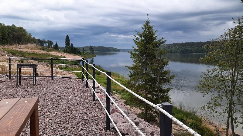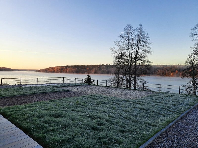Номер находится на втором этаже, на высоте 20 метров от уровня воды. Два панорамных окна с видом на озеро. Перед домом площадка с мангальной зоной, с раскладными креслами для отдыха.