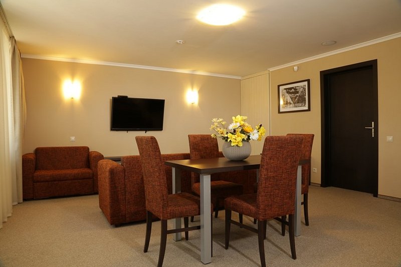 Двухкомнатный номер – спальня и гостиная с двумя санузлами, один из которых оборудован ванной. В гостиной мини-кухня, обеденная зона, мягкая зона отдыха с раскладывающимся двуспальным диваном. Номер оборудован кондиционером, сейфом, цифровым ТВ, 2 основных места, 2 дополнительных на раскладном диване