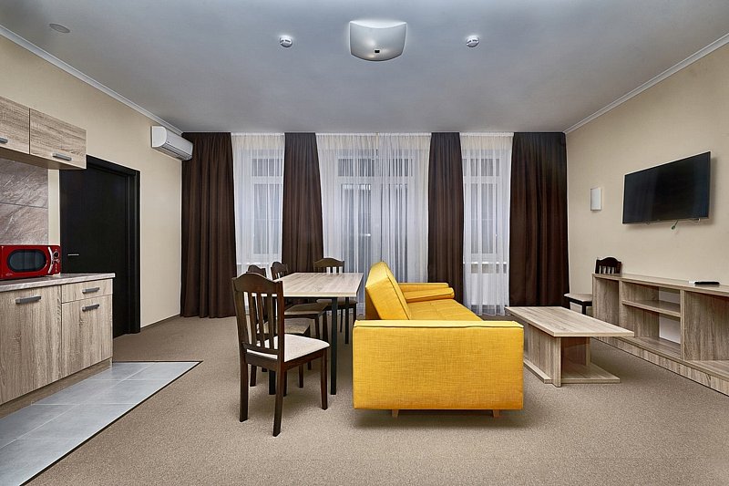 Двухкомнатный номер – спальня и гостиная с двумя санузлами, один из которых оборудован ванной. В гостиной мини-кухня, обеденная зона, мягкая зона отдыха с раскладывающимся двуспальным диваном. Номер оборудован кондиционером, цифровым ТВ. 2 основных места, 2 дополнительных на раскладном диване. Wi-Fi в номерах .