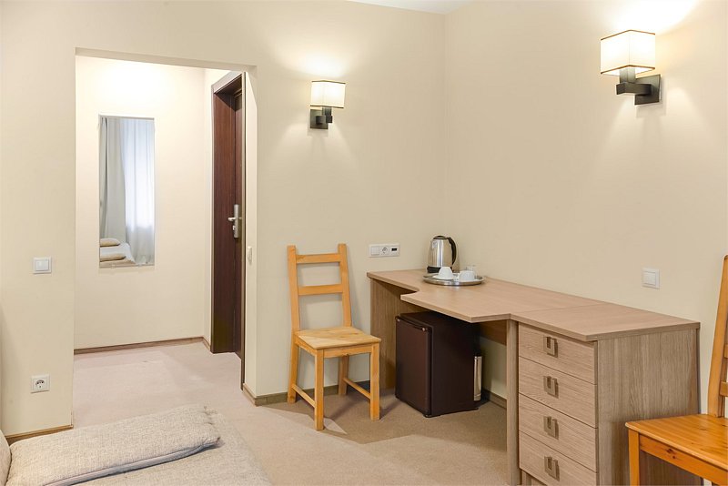 Полуторакомнатный номер-студия с двумя односпальными кроватями, санузлом с душевой кабиной, балконом. Номер разделен на спальную и гостиную зоны. В гостиной двуспальный диван. Номер оборудован сплит-системой, мини-холодильником, сейфом, цифровым ТВ, Wi-Fi.