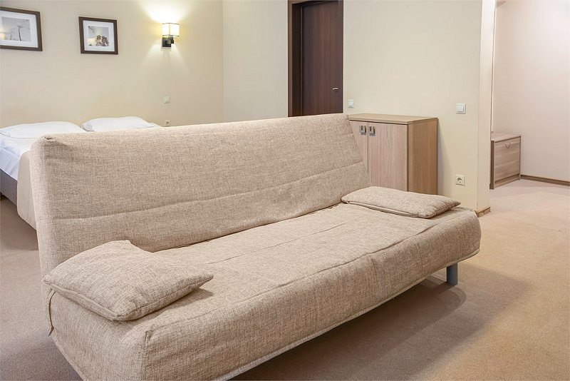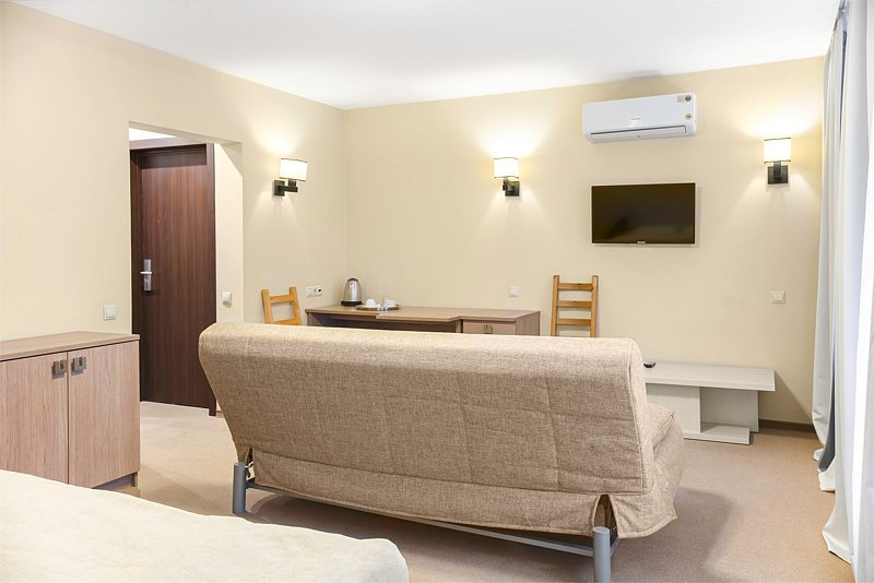 Полуторакомнатный номер с двуспальной кроватью, санузлом с душевой кабиной, балконом. Номер разделен на спальную и гостиную зоны. В гостиной двуспальный диван. Номер оборудован сплит-системой, мини-холодильником, кабельным ТВ. Два основных места и два дополнительных на раскладном диване. Wi-Fi .