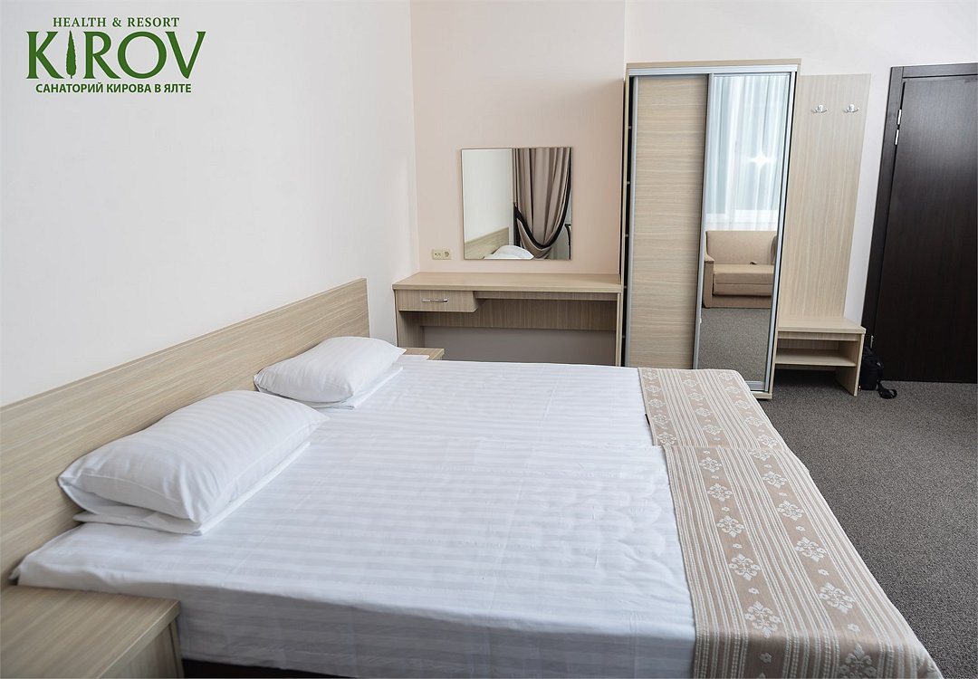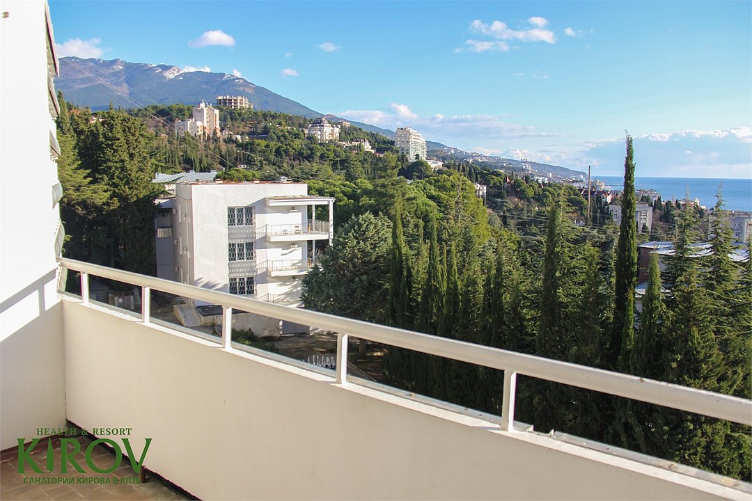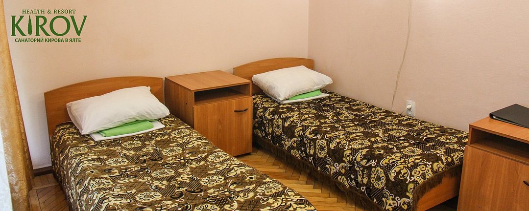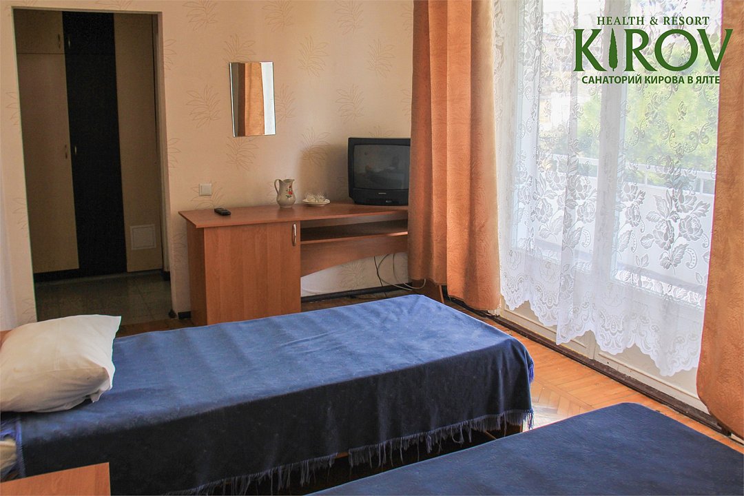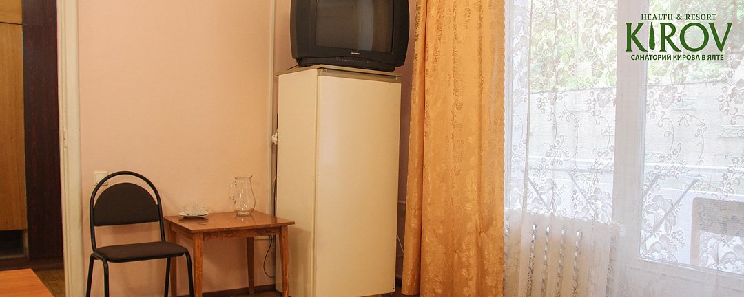 Однокомнатный двухместный номер с большим балконом на южную сторону. Две односпальные кровати, шкаф для одежды, прикроватные тумбочки, бра, туалетный столик с зеркалом, 2 стула. Оборудование: кондиционер, безлимитный Wi-Fi , спутниковое телевидение, 40 каналов, включая детские, холодильник, набор посуды (графин и 2 стакана), кондиционер. Душ, туалет. Полотенца (для лица и банное), полотенцесушитель. Центральное отопление. Вид из окна на внутреннюю территорию санатория. Расположение: корпус 4 Фото и размер номера может отличаться от опубликованных на сайте, но гарантированно имеет описанную комплектацию.Услуги и удобства