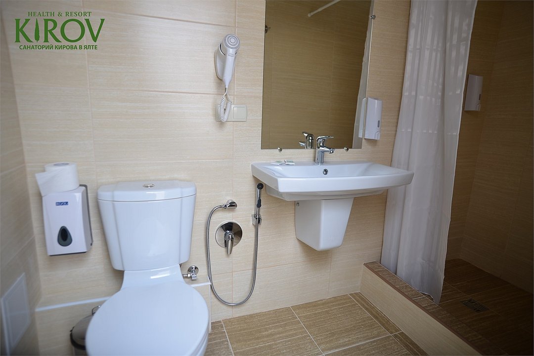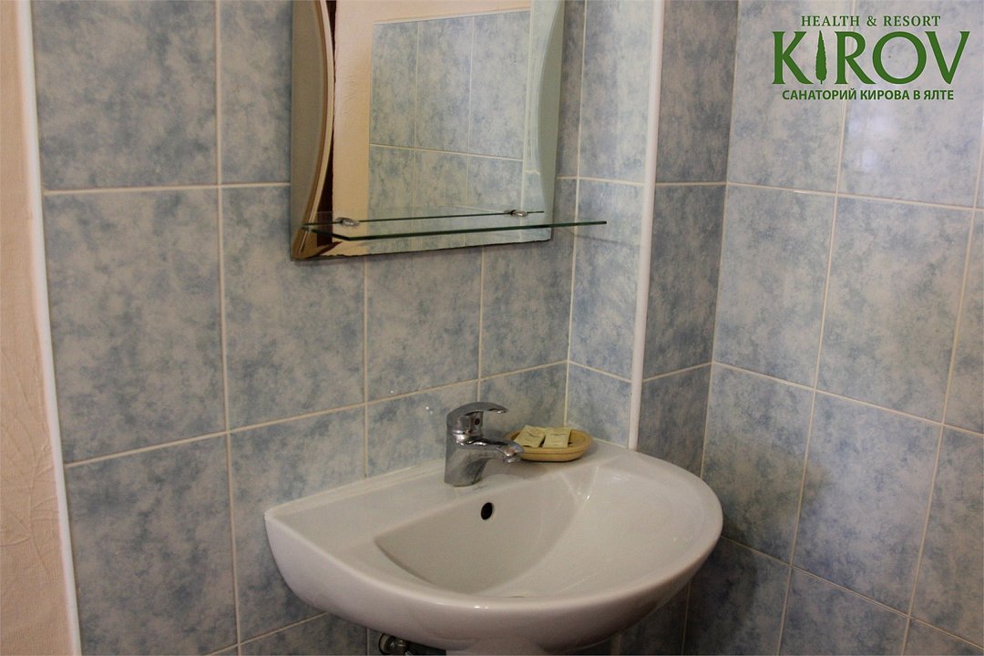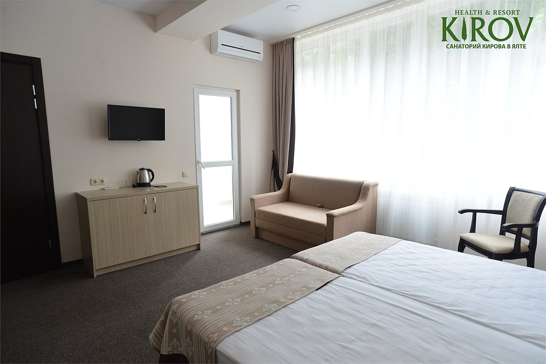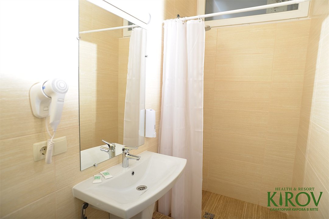 Однокомнатный двухместный номер с большим балконом на южную сторону. Две односпальные кровати, шкаф для одежды, прикроватные тумбочки, бра, туалетный столик с зеркалом, 2 стула. Оборудование: кондиционер, безлимитный Wi-Fi , спутниковое телевидение, 40 каналов, включая детские, холодильник, набор посуды (графин и 2 стакана), кондиционер. Душ, туалет. Полотенца (для лица и банное), полотенцесушитель. Центральное отопление. Вид из окна на внутреннюю территорию санатория. Расположение: корпус 4 Фото и размер номера может отличаться от опубликованных на сайте, но гарантированно имеет описанную комплектацию.Услуги и удобства
