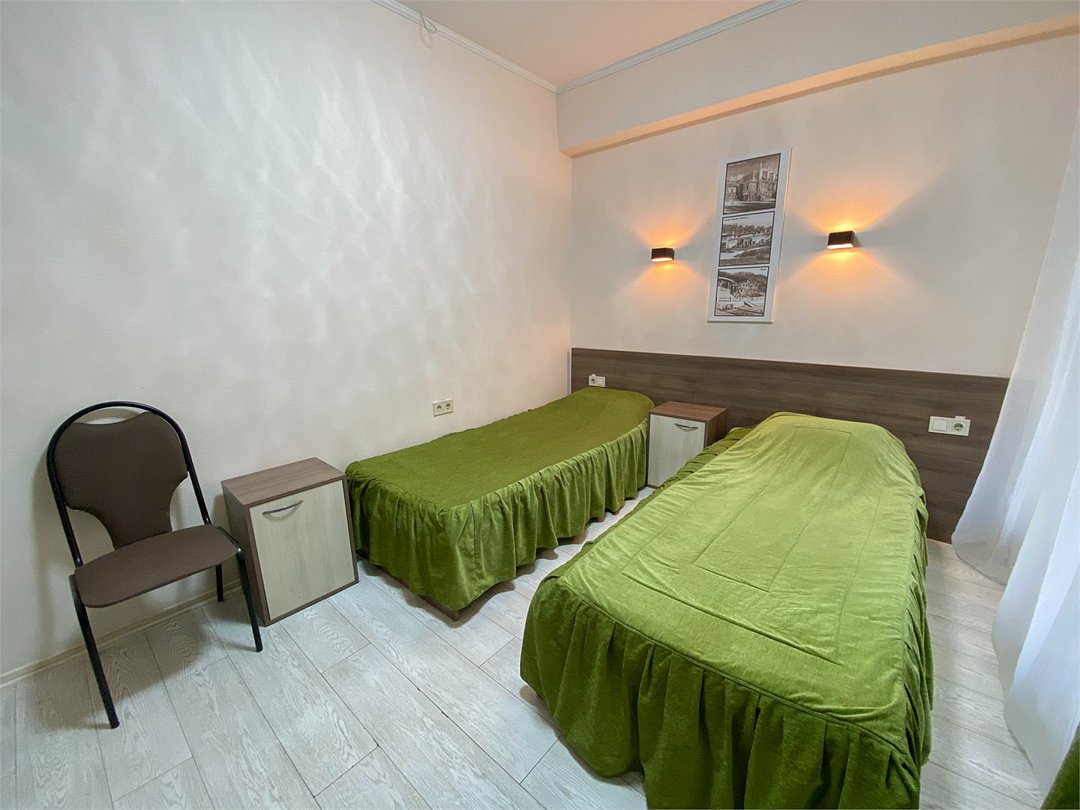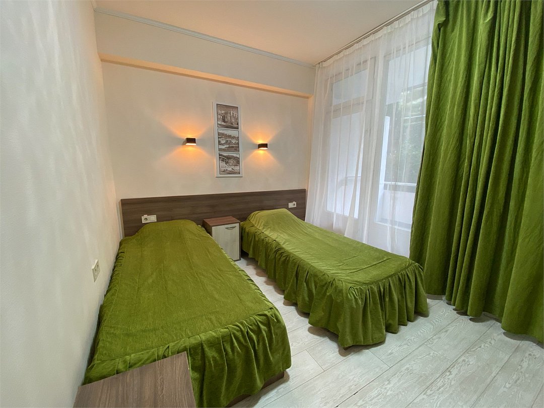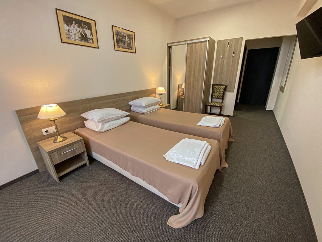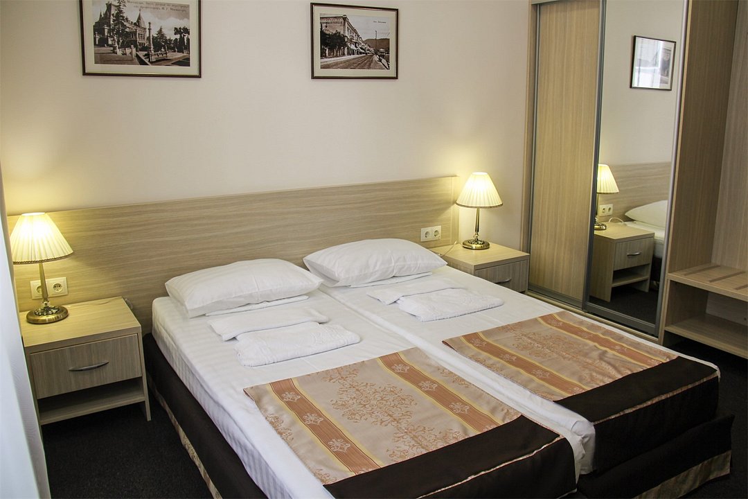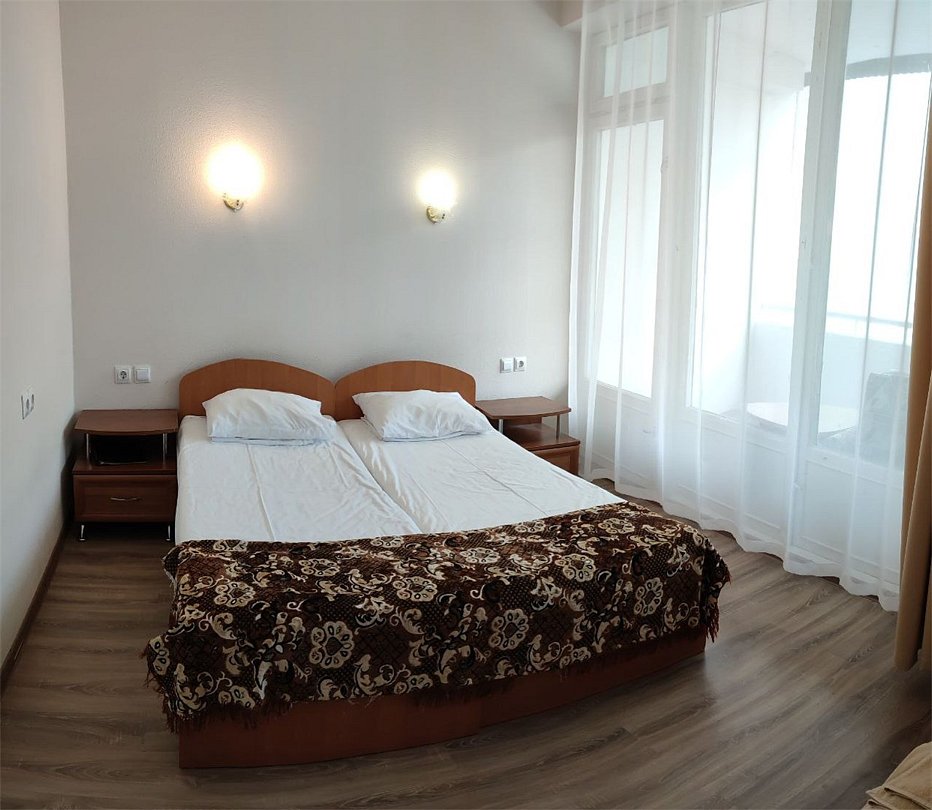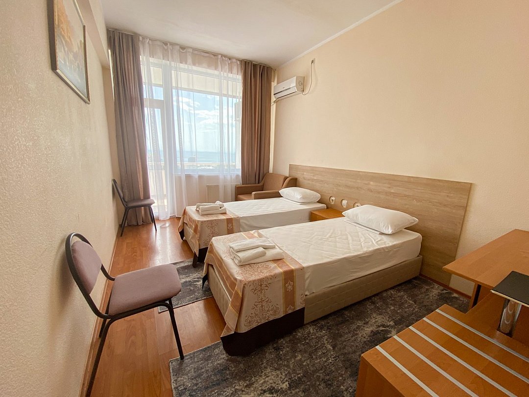 Однокомнатный двухместный номер с большим балконом в тихой зоне. Две односпальные кровати, шкаф для одежды, прикроватные тумбочки, бра, туалетный столик с зеркалом, 2 стула. Оборудование: кондиционер, безлимитный Wi-Fi , спутниковое телевидение, 40 каналов, включая детские, холодильник, набор посуды (графин и 2 стакана), кондиционер. Душ, туалет. Полотенца (для лица и банное), полотенцесушитель. Центральное отопление. Расположение: корпус 4 Фото и размер номера может отличаться от опубликованных на сайте, но гарантированно имеет описанную комплектацию.Услуги и удобства