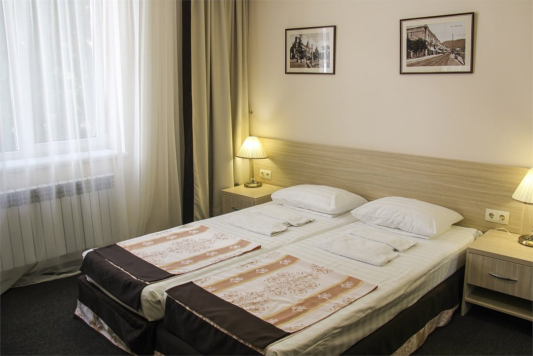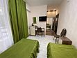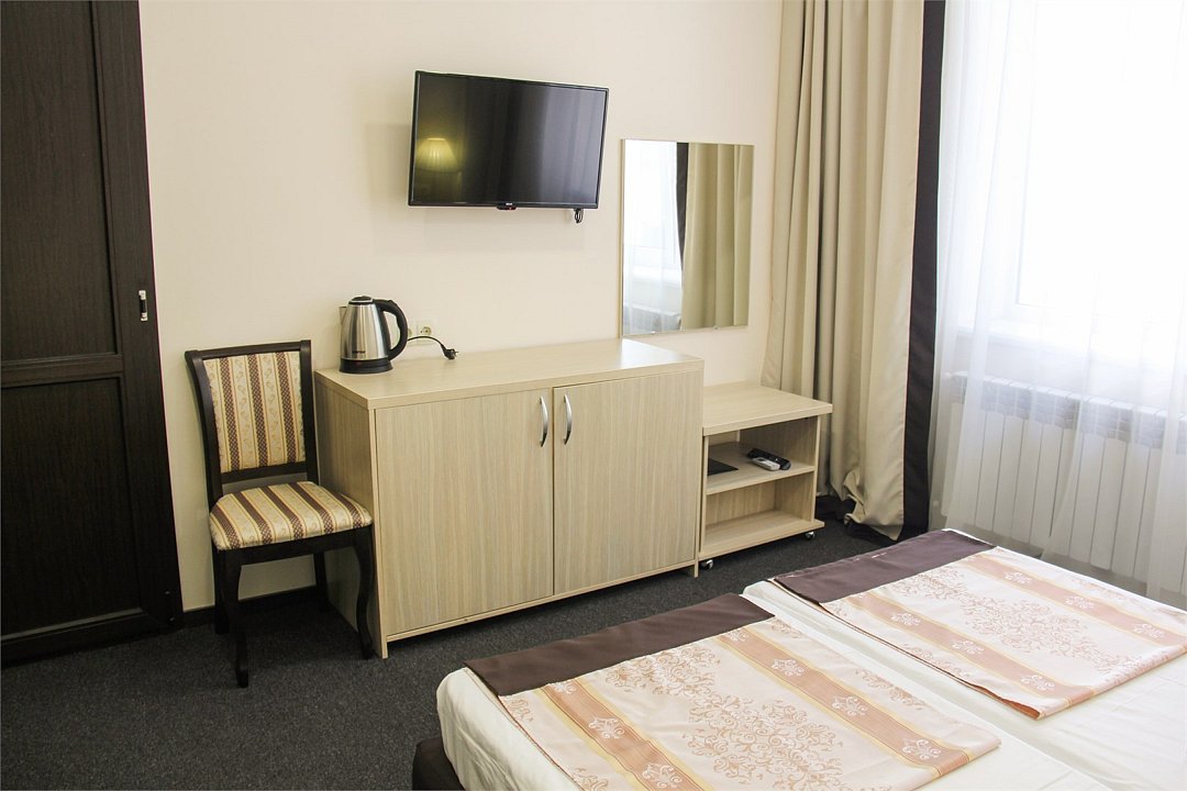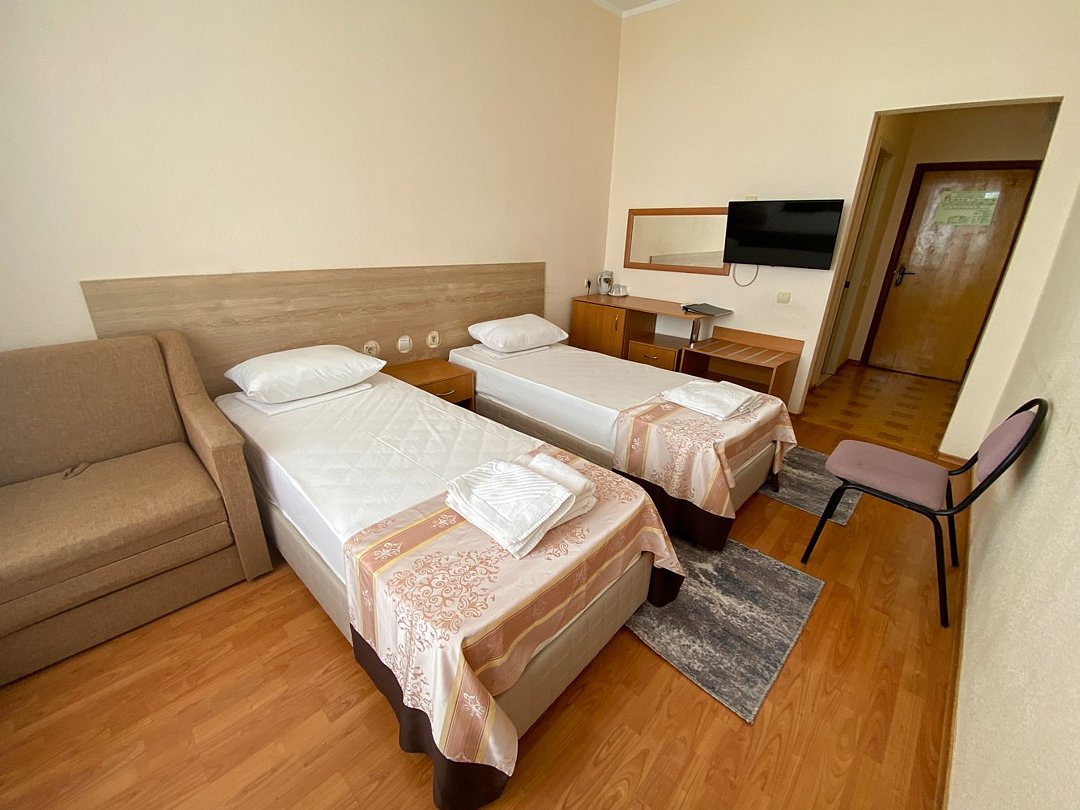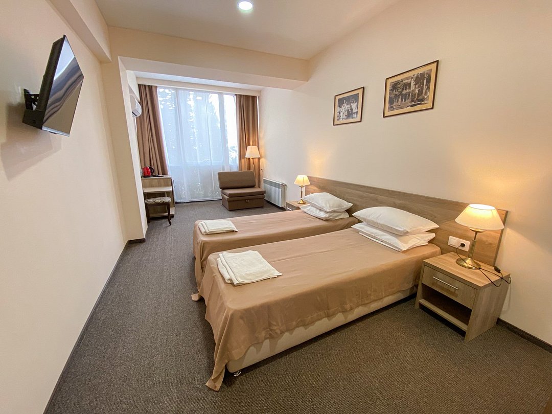 Однокомнатный небольшой современный номер. Две полутороспальные (DBL/TVIN) кровати, прикроватные тумбы, шкаф, письменный стол, зеркало. Современная душевая, тропическая душ-лейка, туалет, гигиенический душ. Полотенца (для лица, банное, для ног), полотенцесушитель, фен, мыло. Оборудование: кондиционер, безлимитный Wi-Fi , LCD TV, спутниковое телевидение, 40 каналов, включая детские, набор посуды (графин и 2 стакана), чайник, барный холодильник, центральное отопление, Покрытие – ковровое или ламинат. Расположение: корпус 3, 4 южная или северная сторона С балконом / без балкона Фото и размер номера может отличаться от опубликованных на сайте, но гарантированно имеет описанную комплектацию.Услуги и удобства