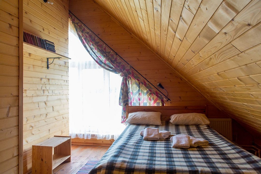На 2-ом этаже: санузел, две спальни с трехместным размещением (двуспальная и односпальная кровати), одна спальня с одноместным размещением.