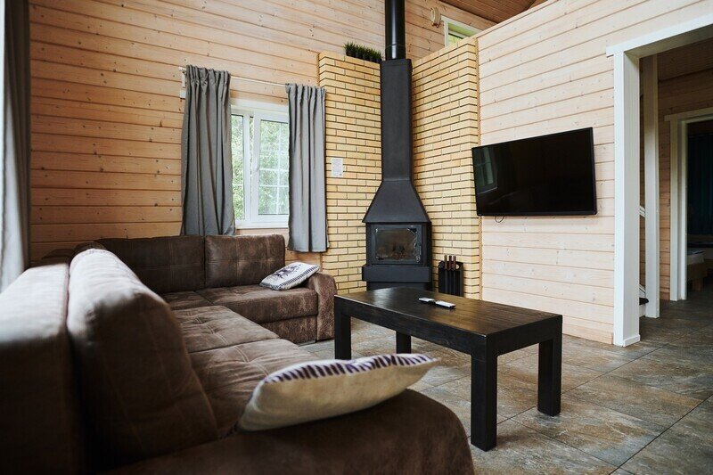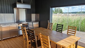 Коттедж со всеми удобствами и отоплением: 2 спальни (в каждой по 2 односпальные кровати) + гостиная с диваном-кроватью и кухня, туалет, душ, терраса, полностью оборудованная кухня (холодильник, плита, духовка, чайник, кофеварка, тостер, микроволновая печь, посудомоечная машина, все кухонные принадлежности), стиральная машина, телевизор с плоским экраном, постельное белье, полотенца, тапочки, утюг, фен, сушилка для белья, мебель на улице, все необходимые принадлежности для барбекю.