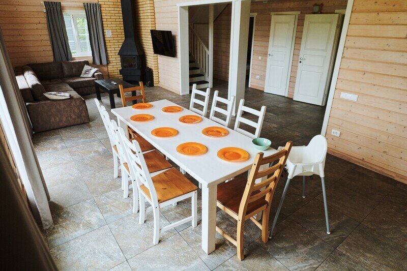 Большой коттедж со всеми удобствами и отоплением: кухня, 6 спален + гостиная с диваном-кроватью, 3 санузла, 4 душа, сауна, терраса, стол для настольного тенниса, полностью оборудованная кухня (холодильник, плита, духовка, чайник, кофеварка, тостер, микроволновая печь, посудомоечная машина, все кухонные принадлежности), стиральная машина, телевизор с плоским экраном, постельное белье, полотенца, тапочки, утюг, фен, сушилка для белья, все необходимые принадлежности для барбекю.
