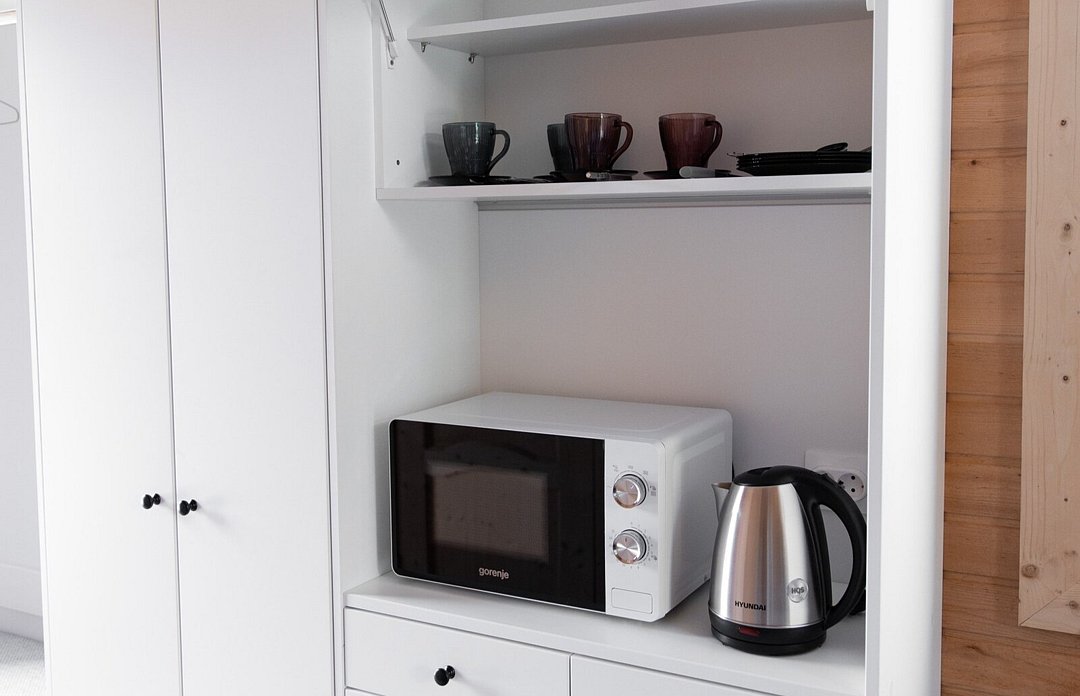 Двуспальная кровать, холодильник, микроволновка, чайник, с/у душ