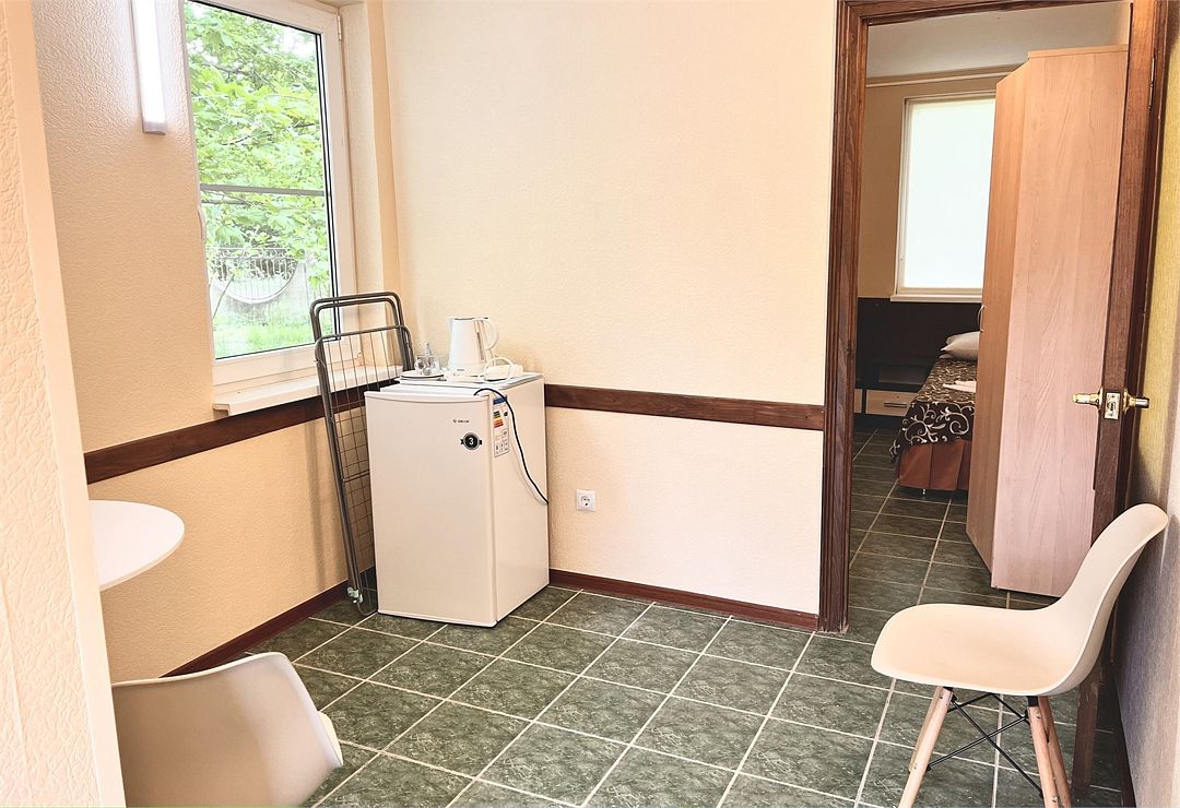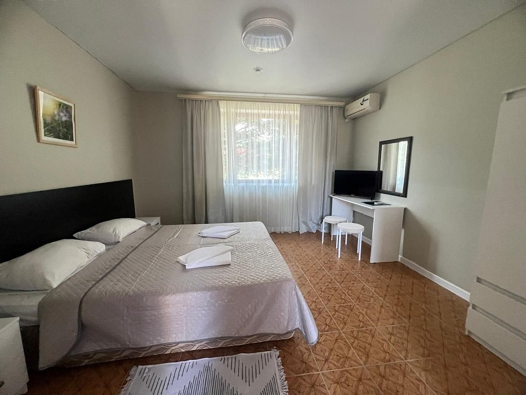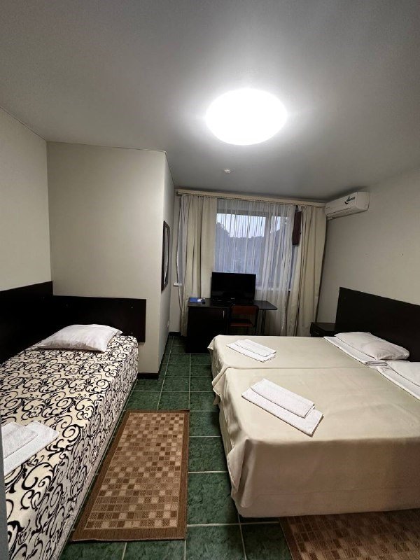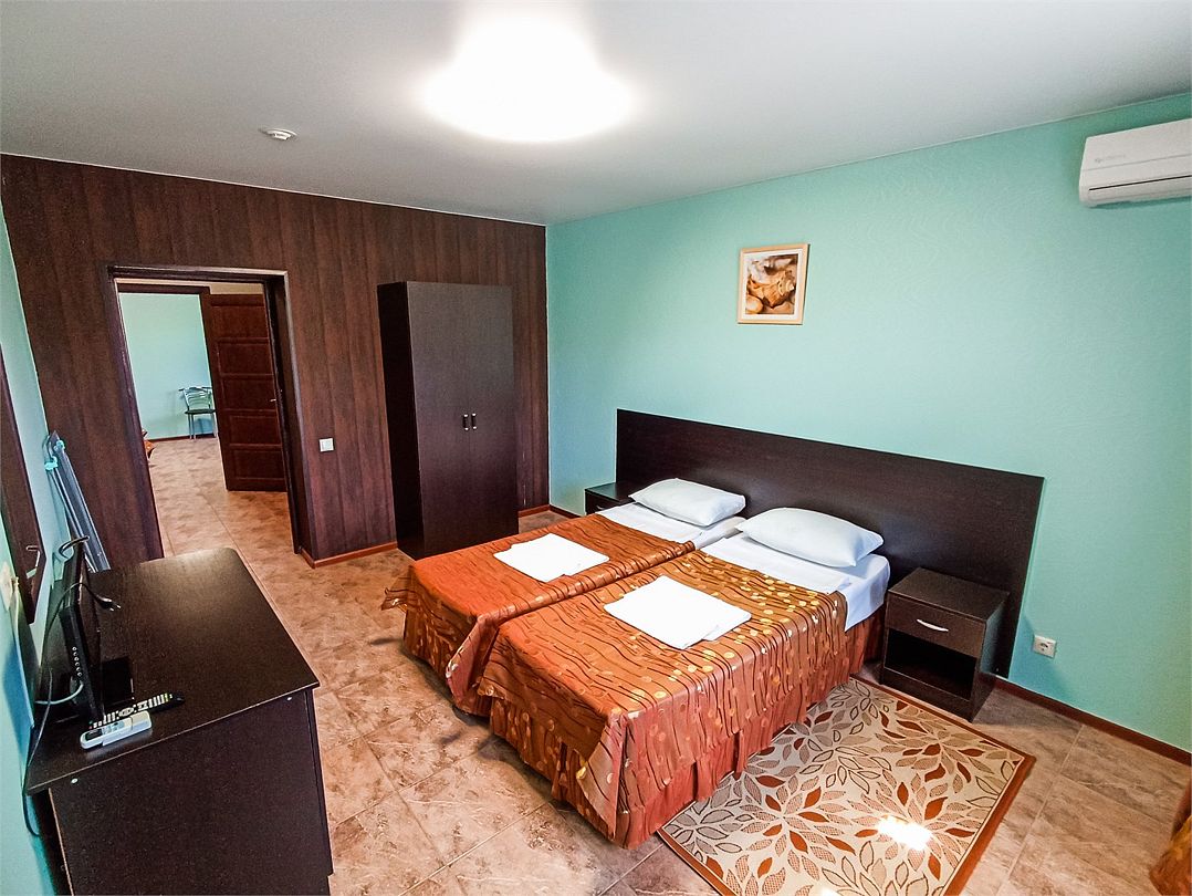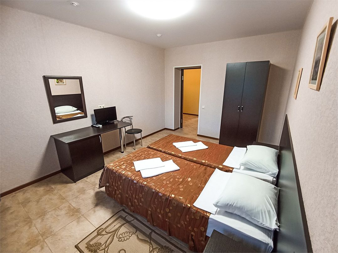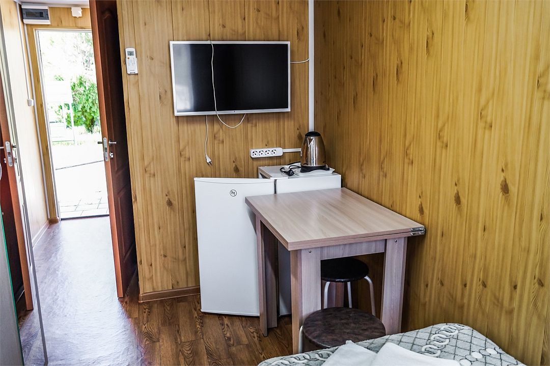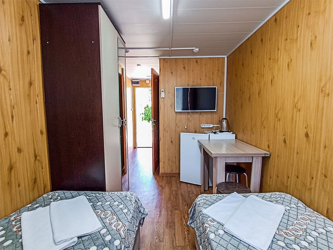 Просторный номер: 2х спальная кровать, односпальная кровать,шкаф, тумбочки, телевизор, кондиционер. Кухонный уголок: стол, холодильник, эл.чайникКомфорт 2х местный (корпус 4 , 1 этаж)