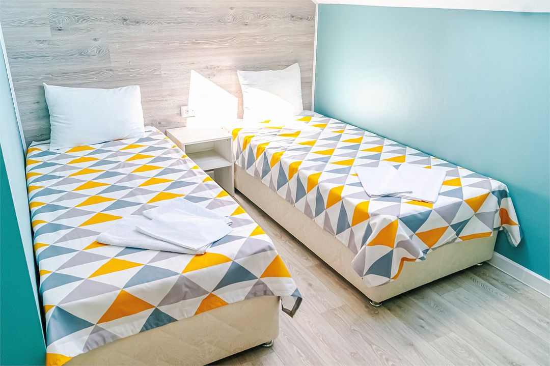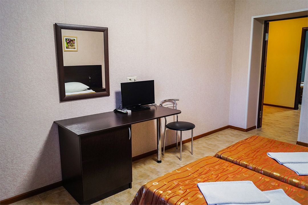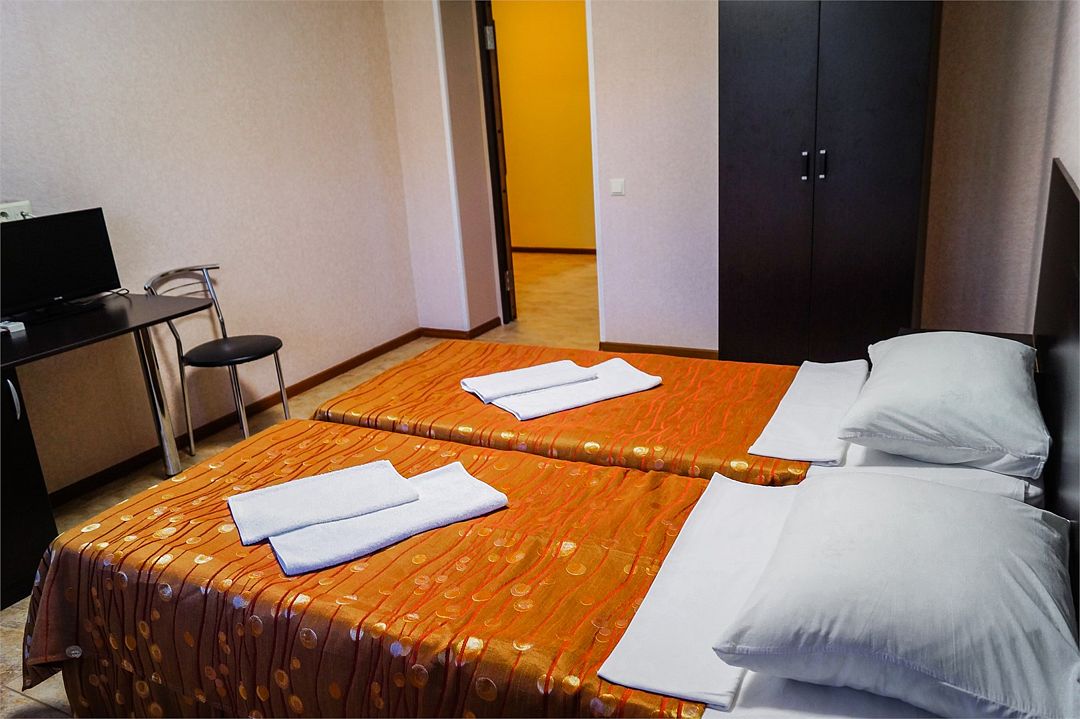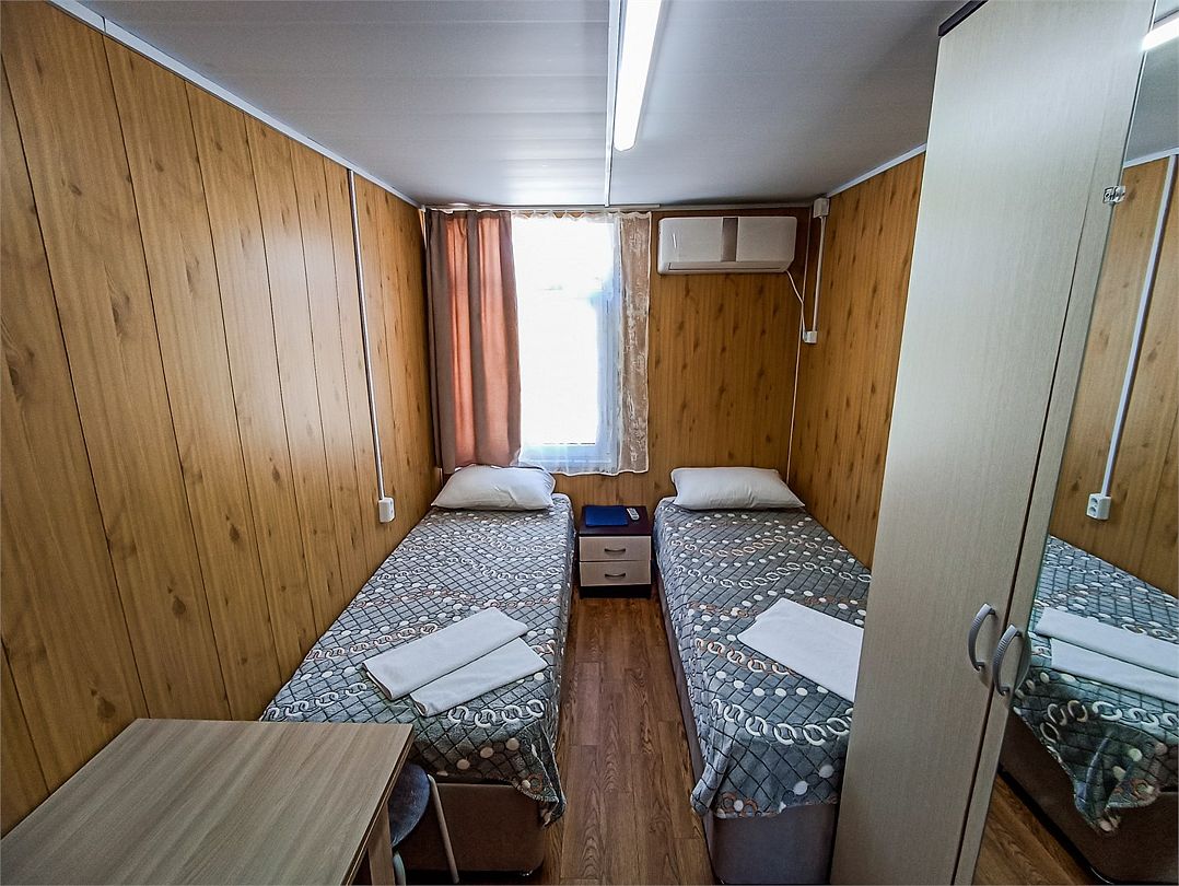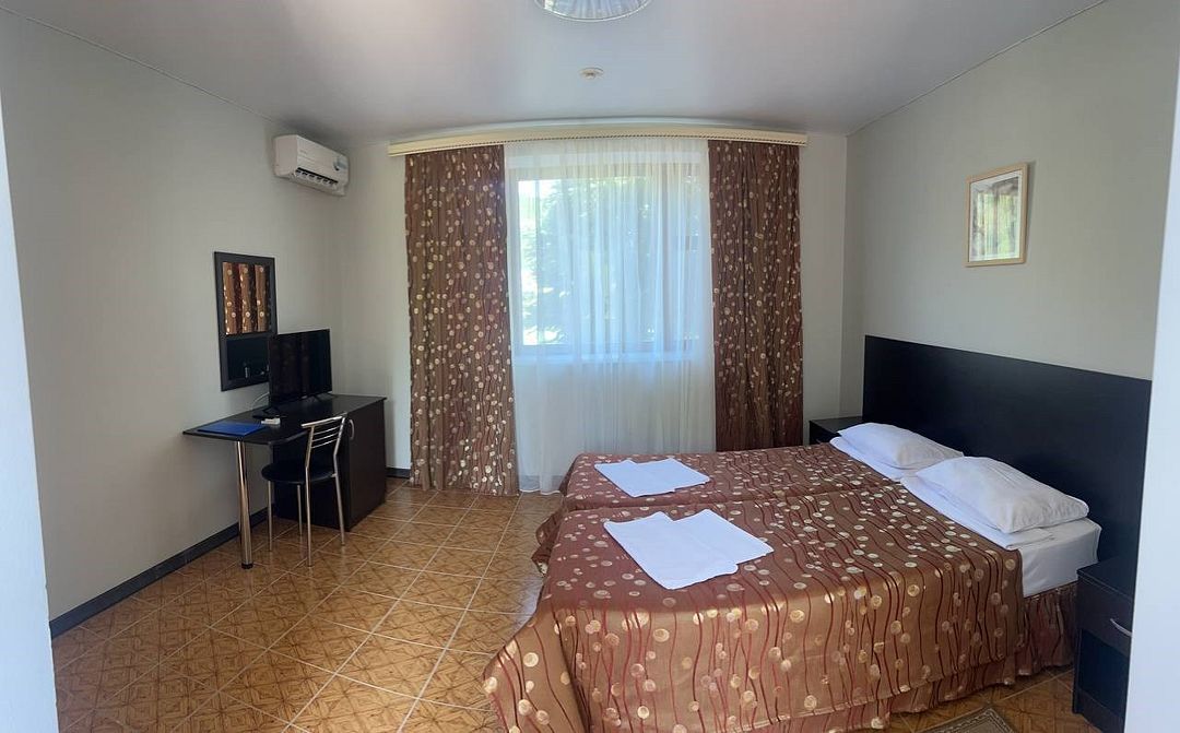 Классический номер: две кровати, тумбочка, шкаф, стол, стулья, холодильник, кондиционер, телевизор.Услуги и удобства