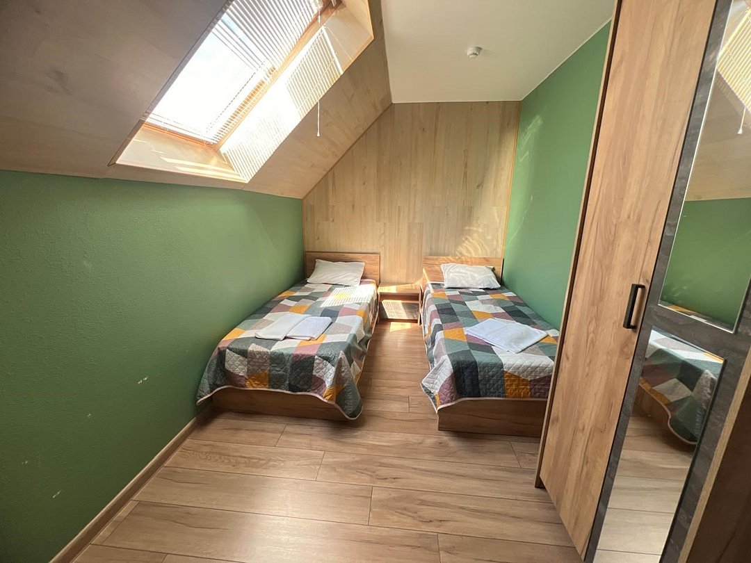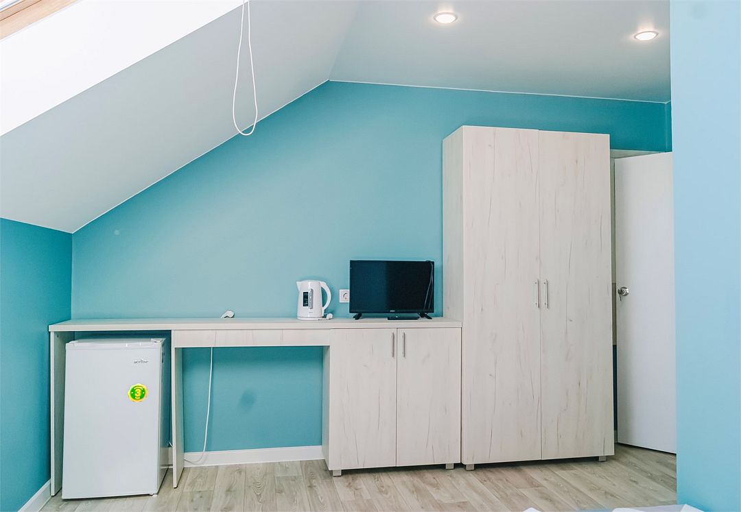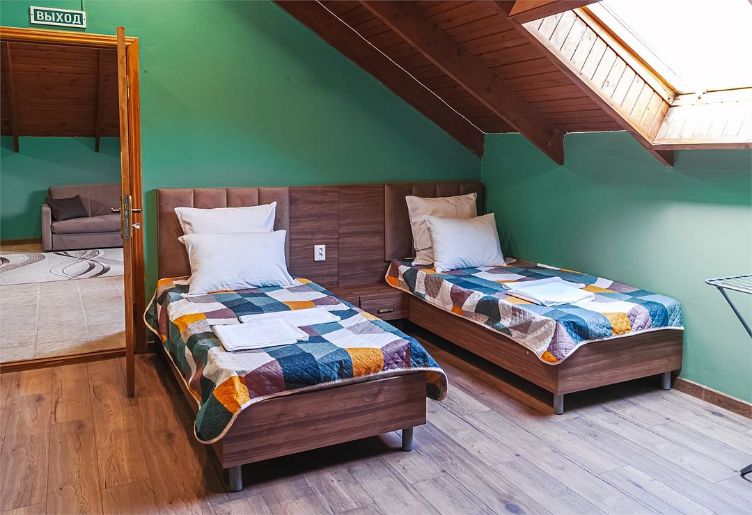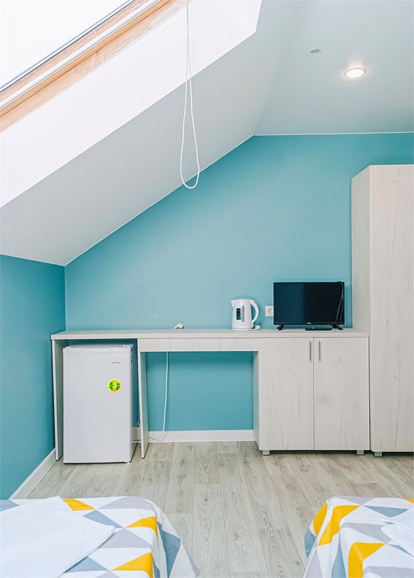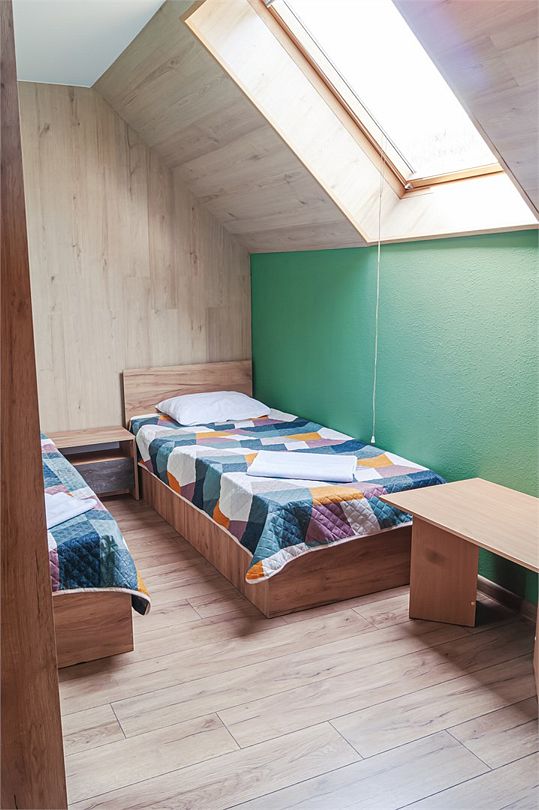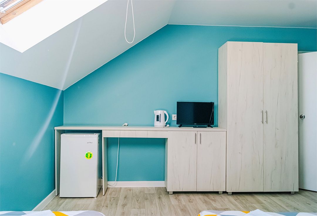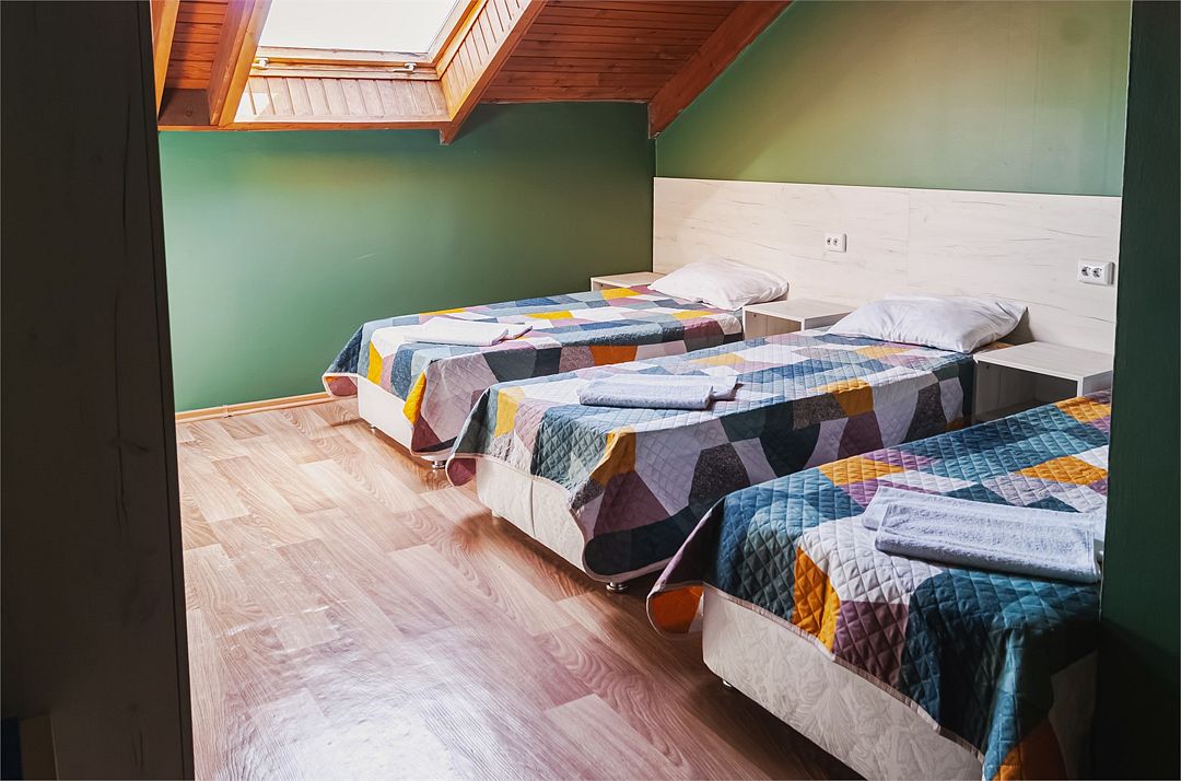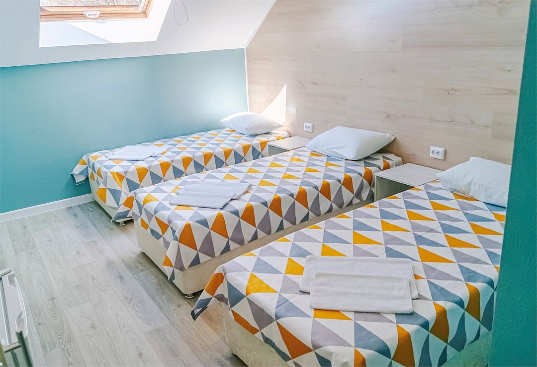Классический номер мансардного типа: три кровати, комод, тумбочки, вешалка, столик, стулья, эл.чайник, холодильник., телевизор. Cанузел: душ-поддон, унитаз, раковина.Услуги и удобства