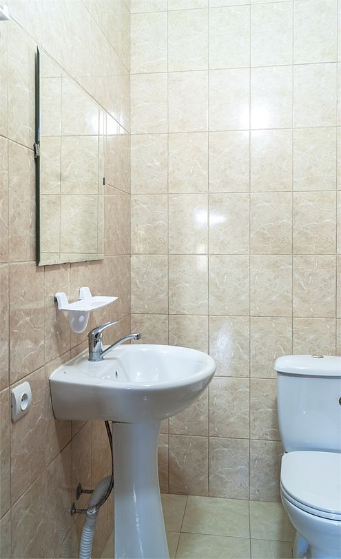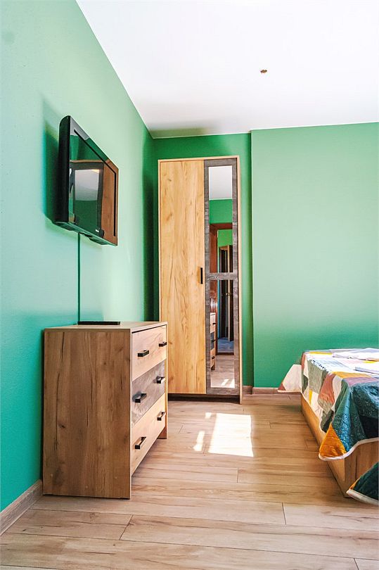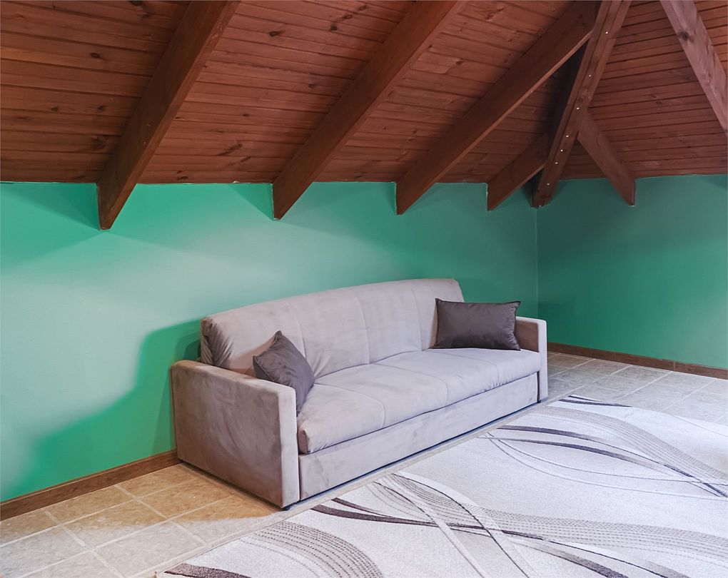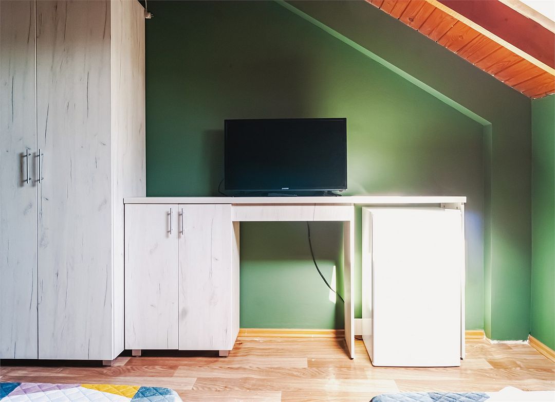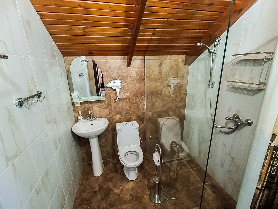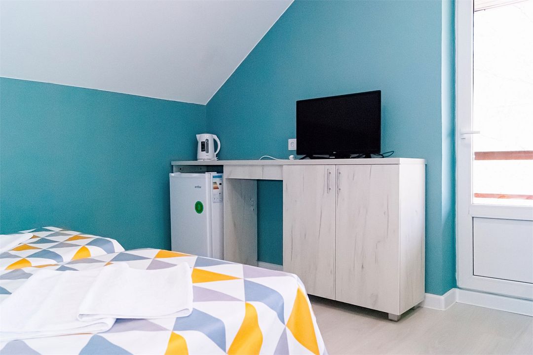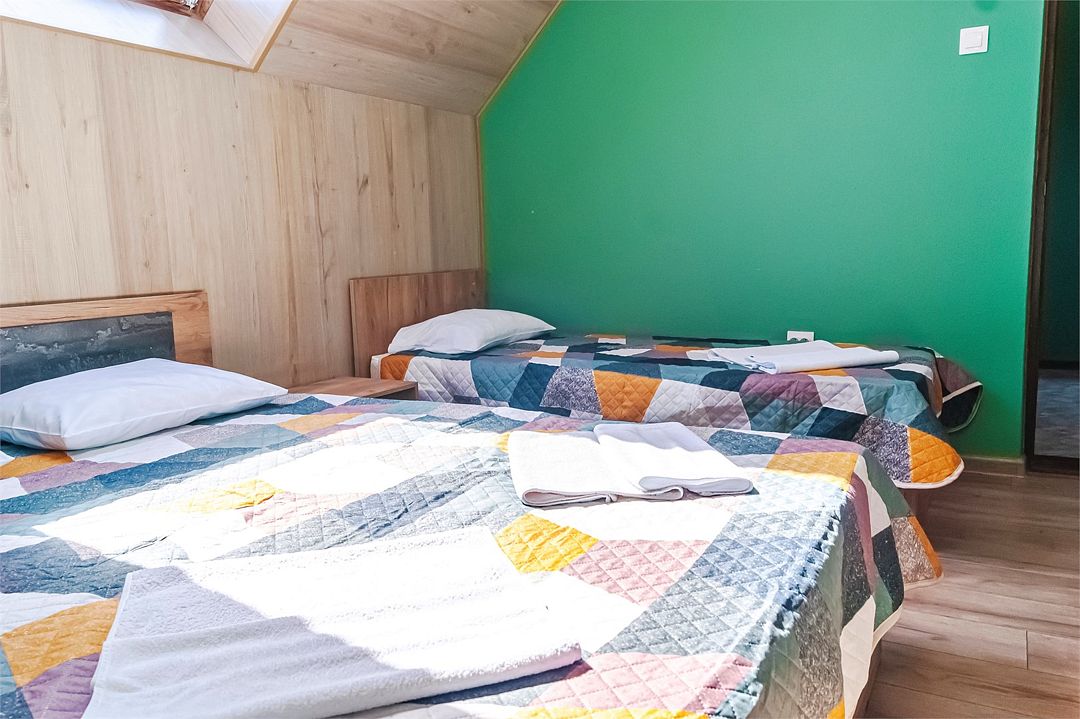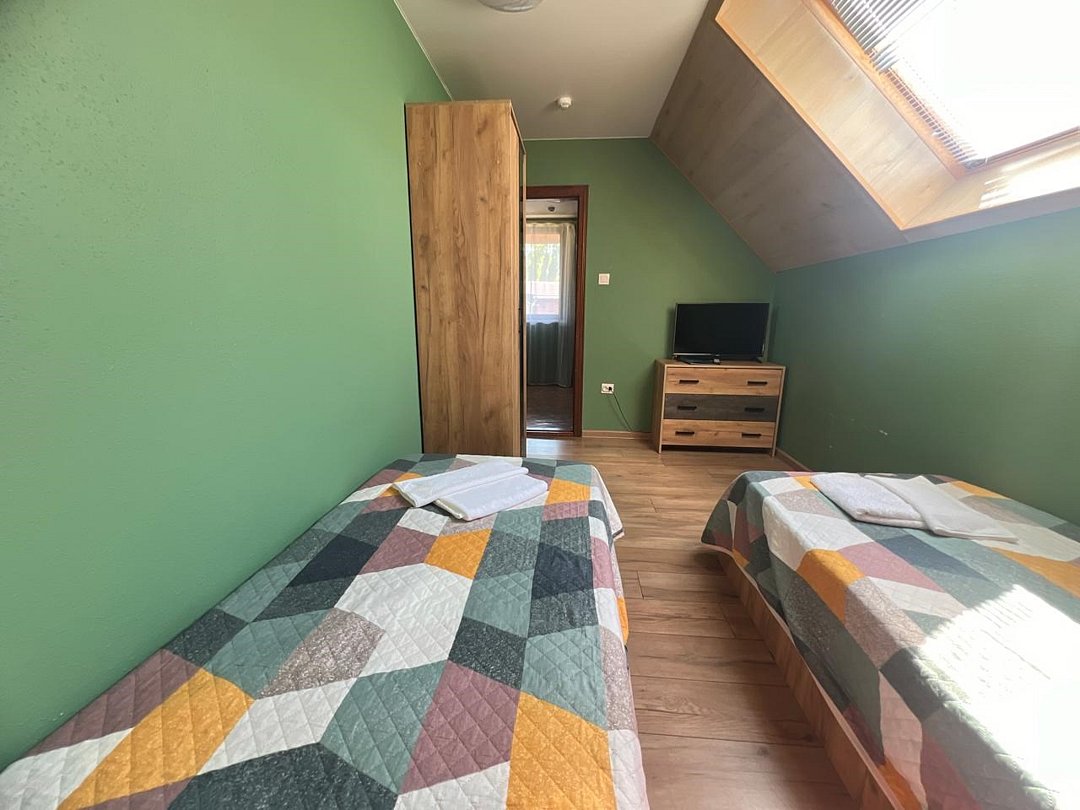 Классический номер мансардного типа: три кровати, комод, тумбочки, вешалка, столик, стулья, эл.чайник, холодильник., телевизор. Cанузел: душ-поддон, унитаз, раковина.Услуги и удобства