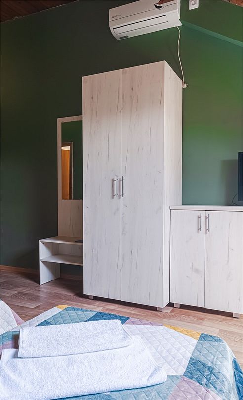 телевизор, холодильник, терраса, двуспальная кровать, односпальная кровать, стулья, зеркало, унитаз, раковина, отдельный вход в номер, душ, стол, сплит-система, шкаф-купеВ гостиничном номере