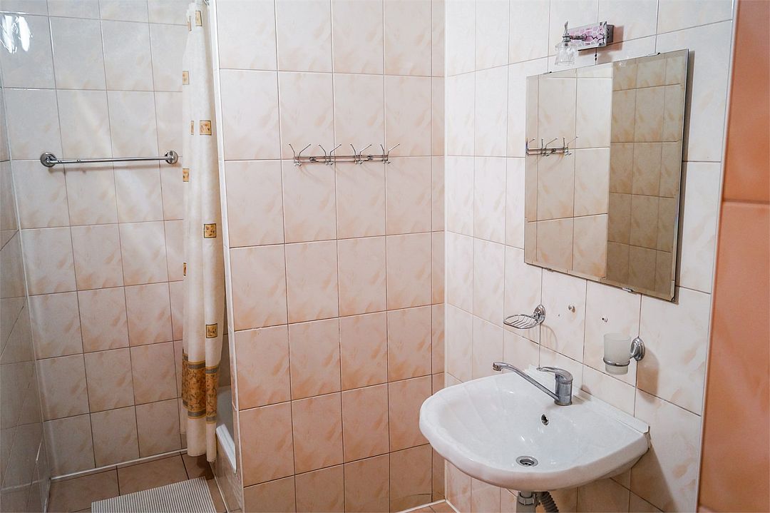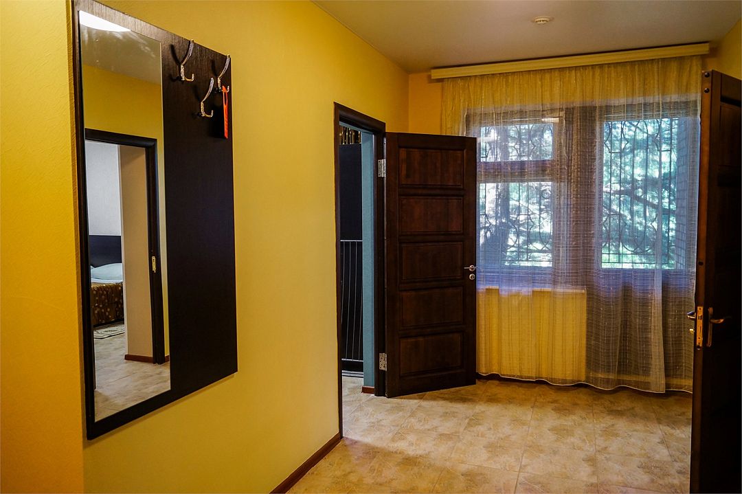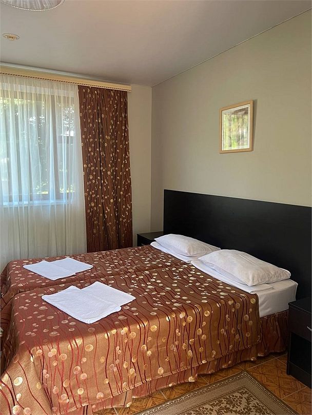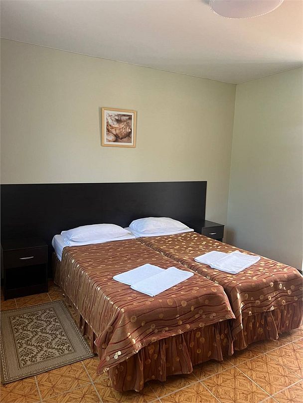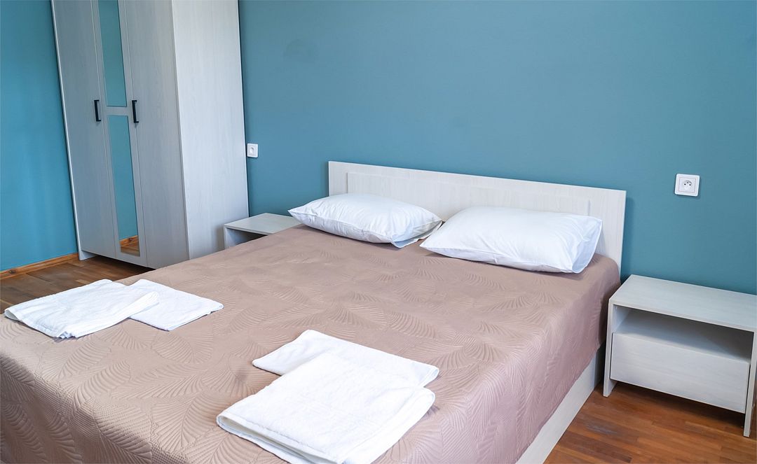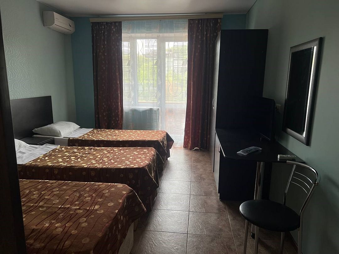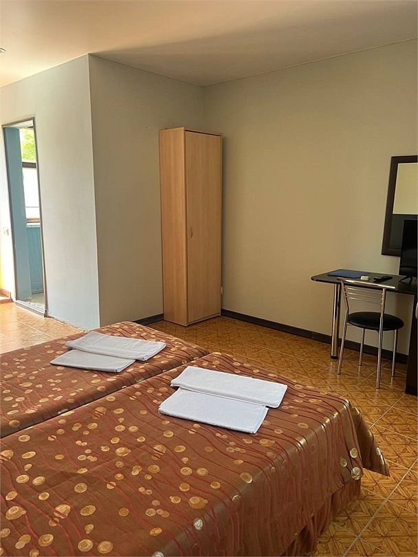 Классический номер: гардеробная, одна 2х спальная кровать, одна односпальная кровать, тумбочки, столик, стулья, телевизор, эл.чайник, холодильник, кондиционер. Cанузел: душ -поддон, унитаз, раковина.Услуги и удобства
