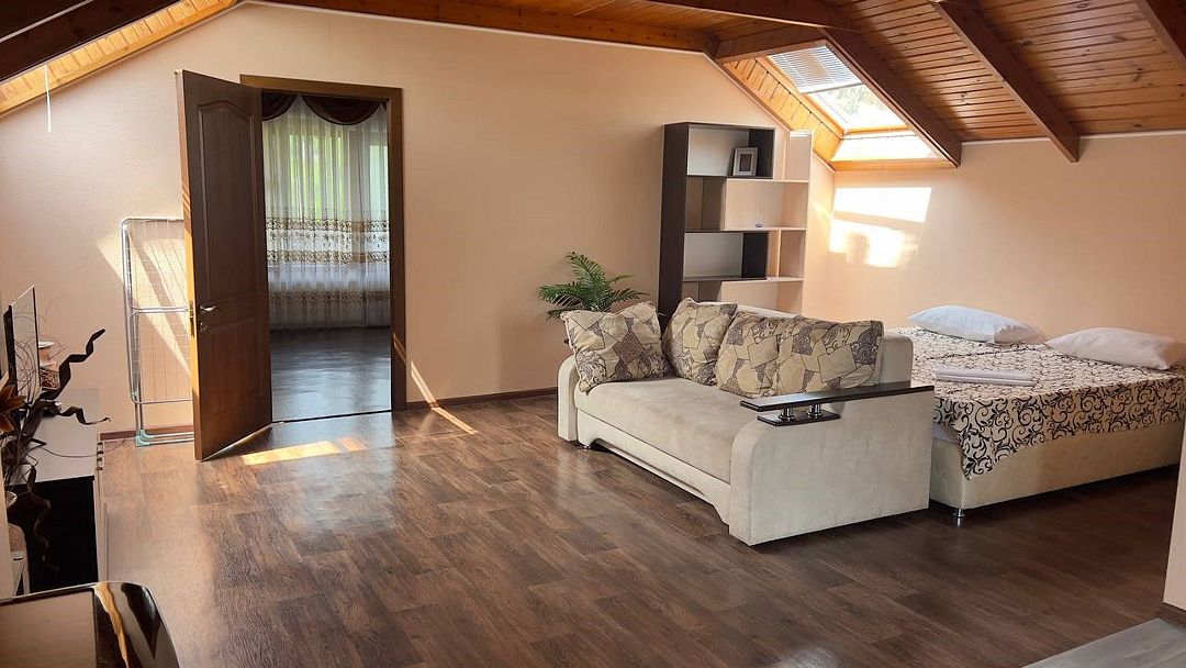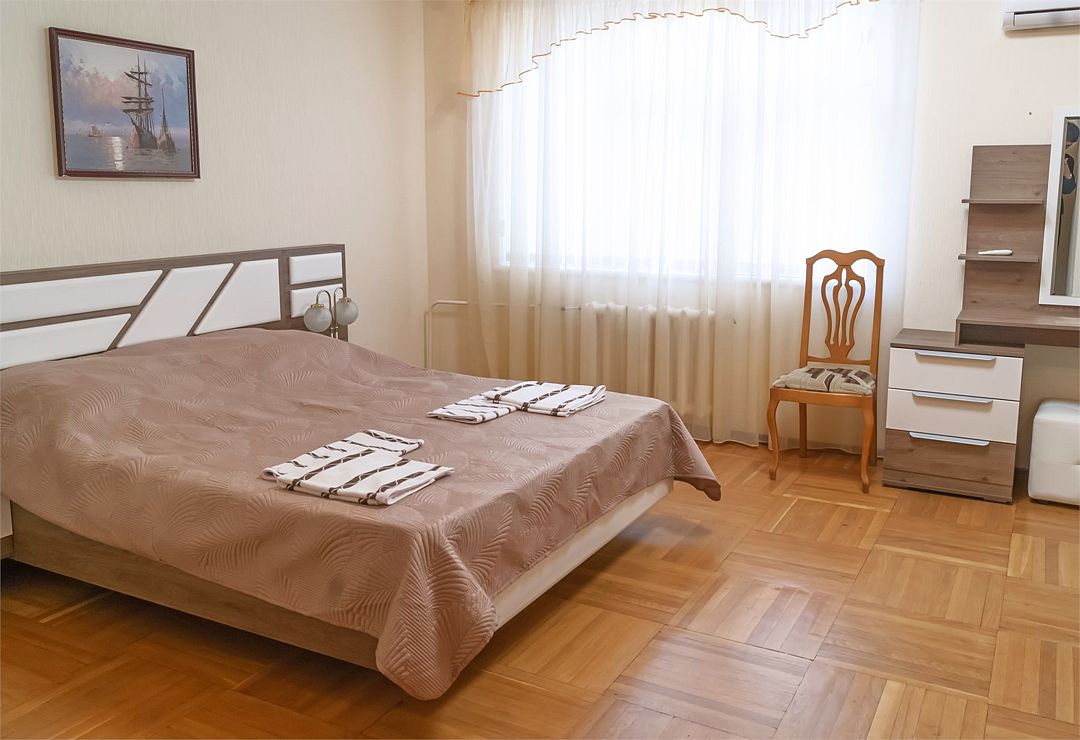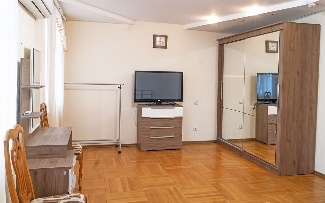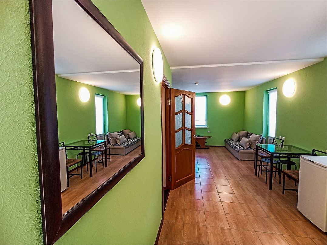 Просторный номер. Гостиная: мягкая мебель, телевизор, журнальный столик, шкаф для одежды, комод, кондиционер. Спальня: большая 2-х спальная кровать, две односпальные кровати, тумбочки. Кухонный уголок: стол, стулья, холодильник, эл.чайник.Услуги и удобства