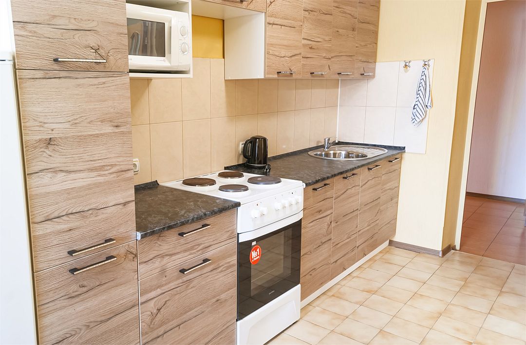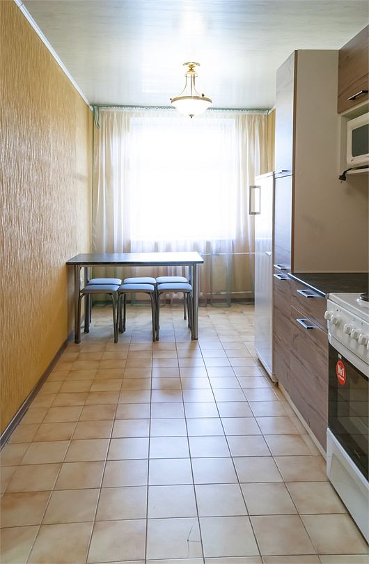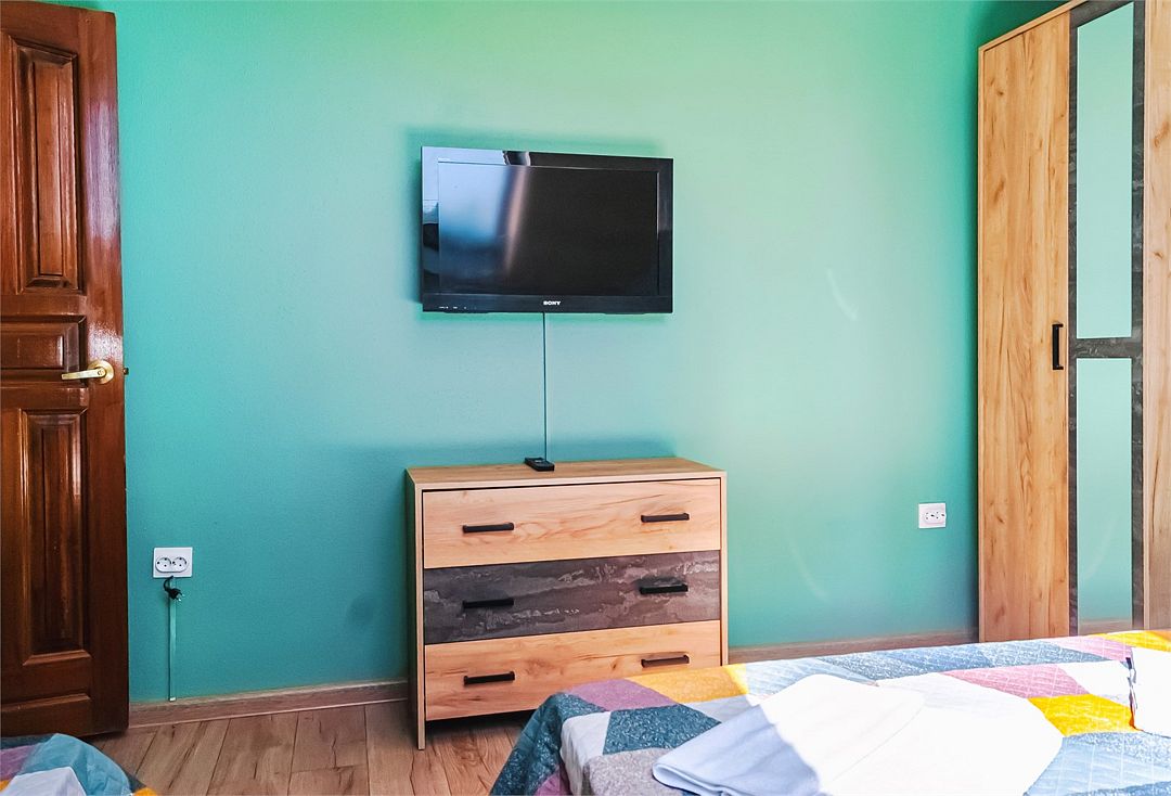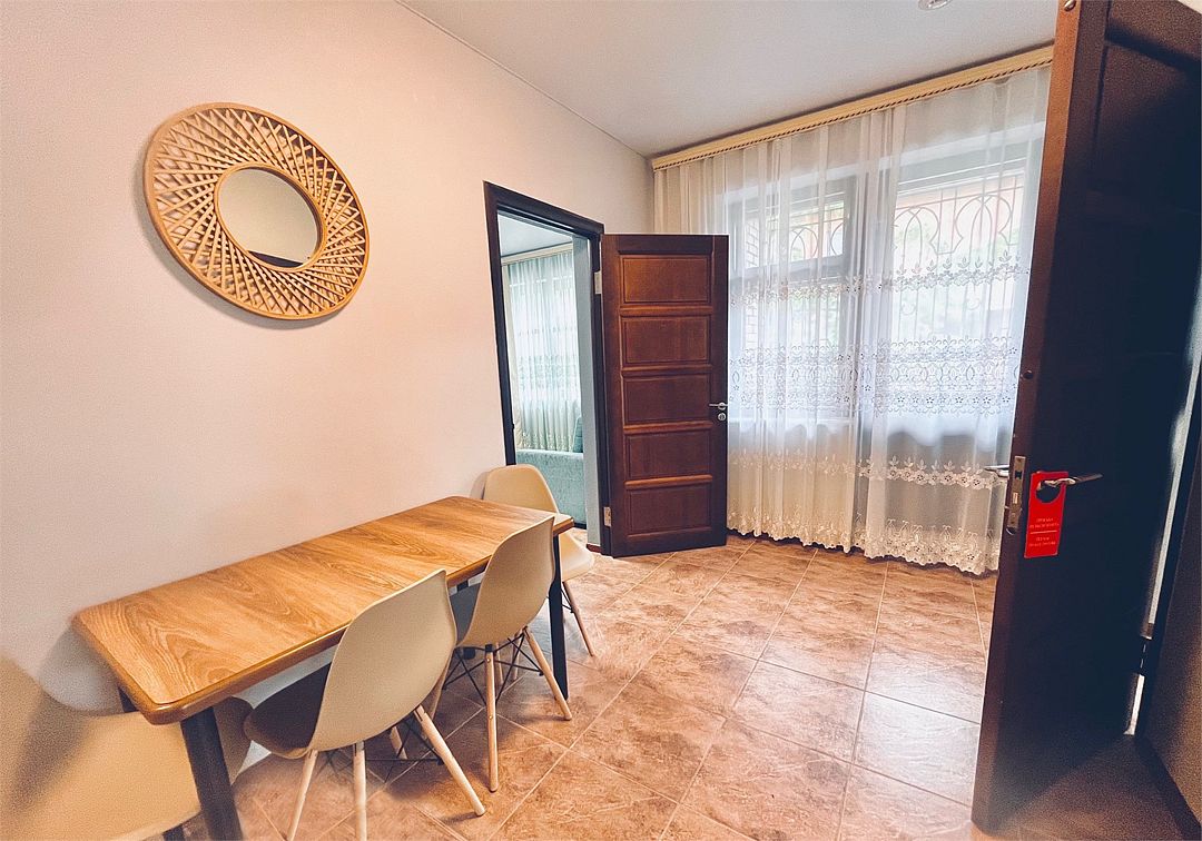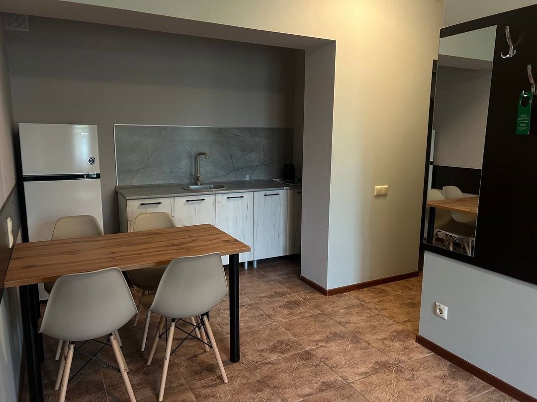 Просторный номер. Гостиная: мягкая мебель, телевизор, журнальный столик, шкаф для одежды, комод, кондиционер. Спальня: большая 2-х спальная кровать, две односпальные кровати, тумбочки. Кухонный уголок: стол, стулья, холодильник, эл.чайник.Услуги и удобства