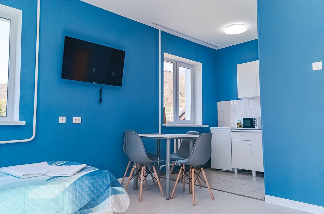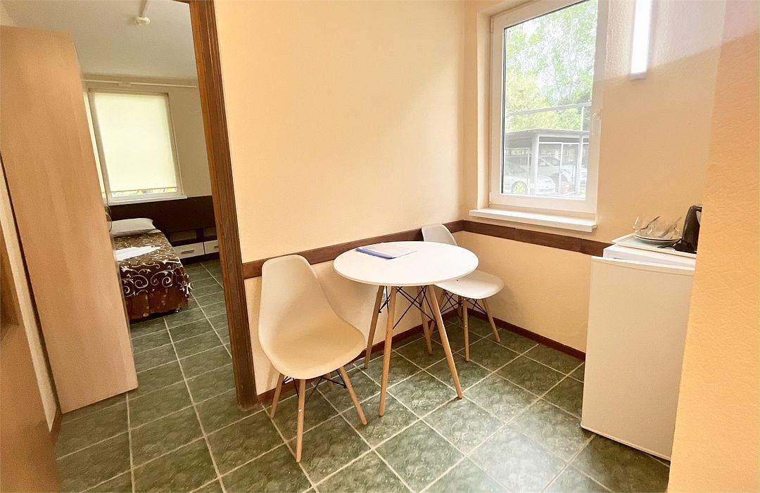 2-комнатный номер с балконом. Гостиная: кухонный уголок, стол, стулья, холодильник, эл.чайник, вешалка. Спальня: одна 2х спальная кровать, одна односпальная кровать, тумбочки, шкаф, телевизор. Cанузел: душ-поддон, унитаз, раковина.Услуги и удобства