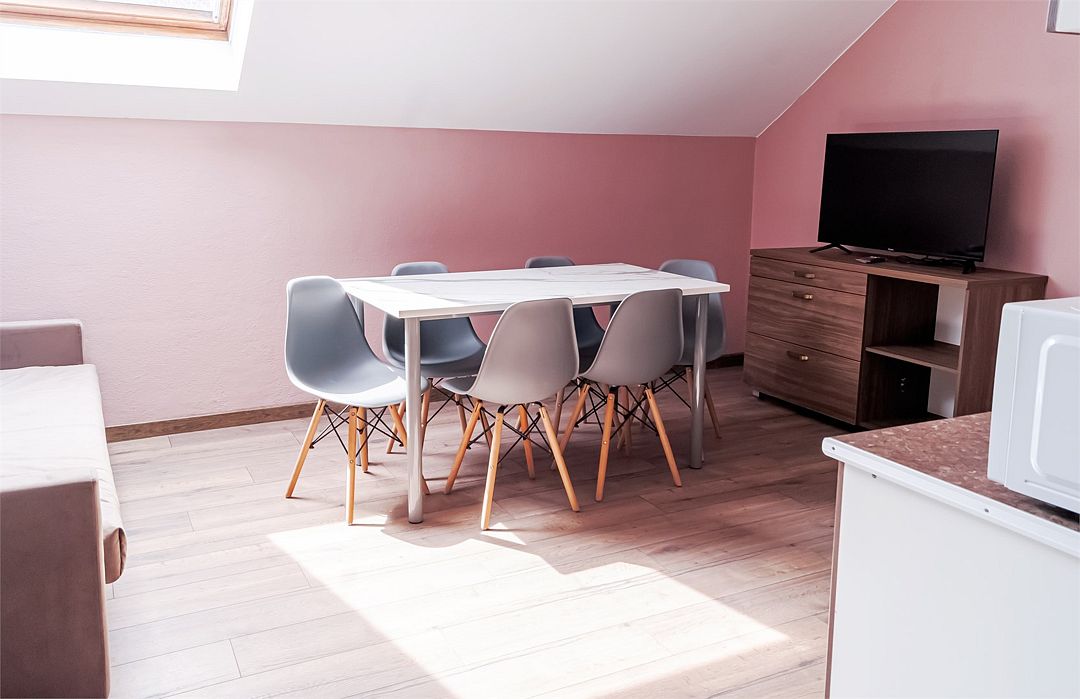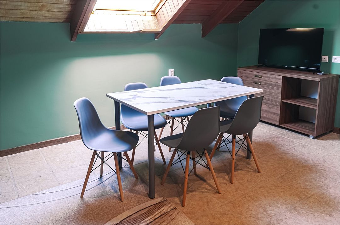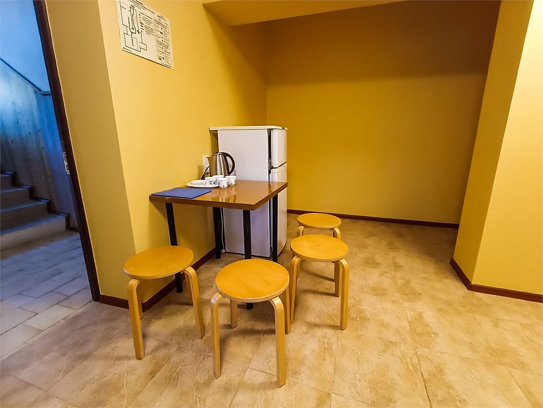 телевизор, холодильник, стулья, шкаф для одежды, обеденный стол, чайник, унитаз, раковина, душ, шесть односпальных кроватей, сплит-система, мансардные окнаВ гостиничном номере