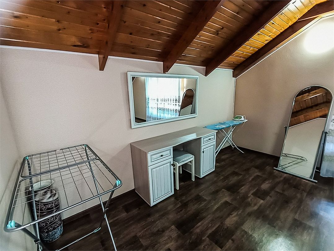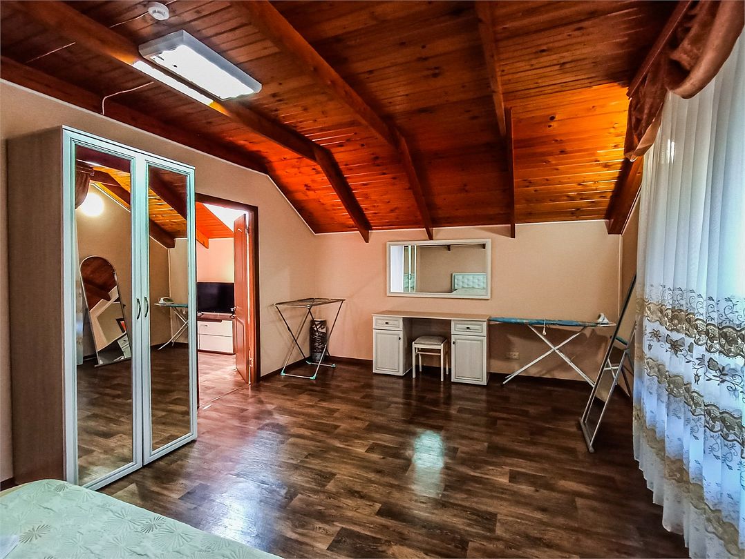 Классический номер мансардного типа: три кровати, комод, тумбочки, вешалка, столик, стулья, эл.чайник, холодильник, кондиционер, телевизор . Cанузел: душ-поддон, унитаз, раковина.Услуги и удобства