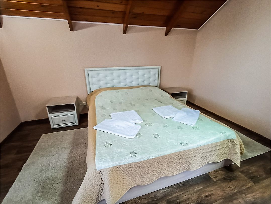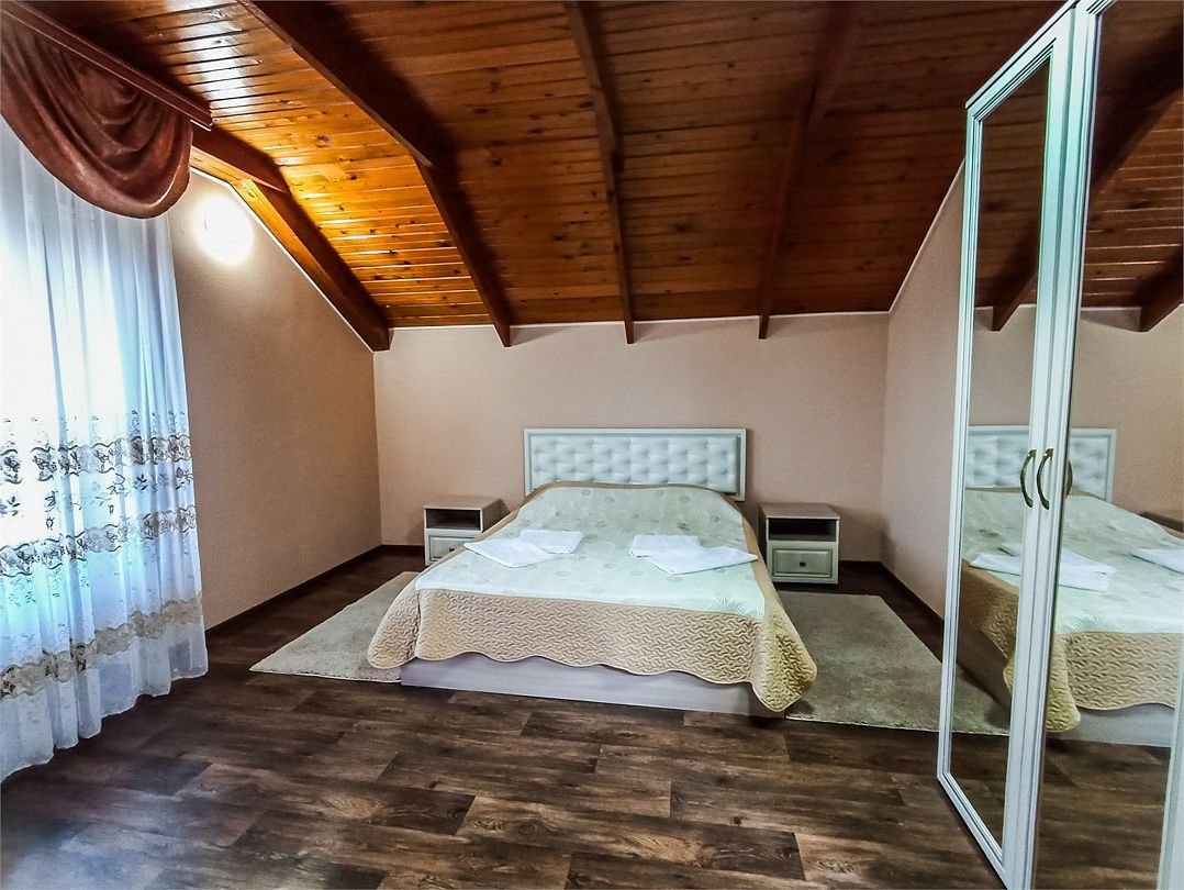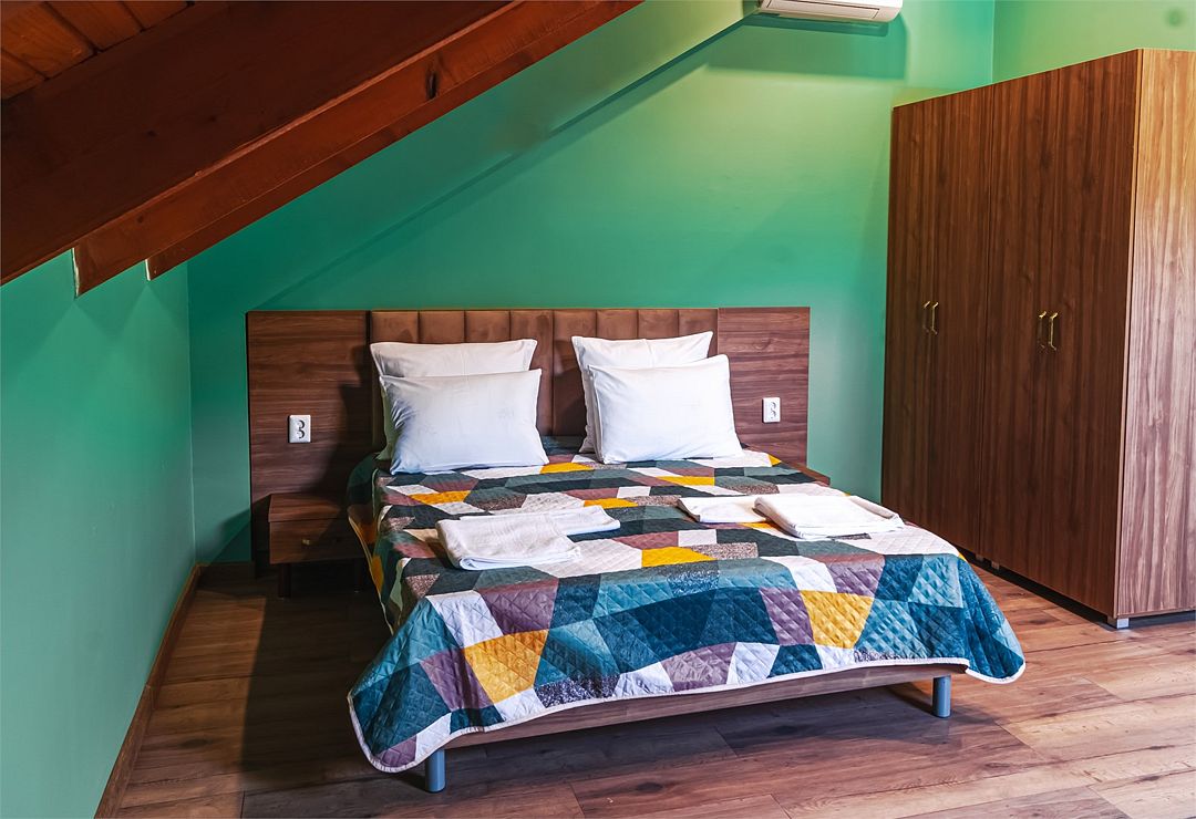 Классический номер мансардного типа: две кровати, комод, тумбочки, вешалка, столик, стулья, эл.чайник, холодильник, кондиционер, телевизор . Cанузел: душ-поддон, унитаз, раковина.Услуги и удобства