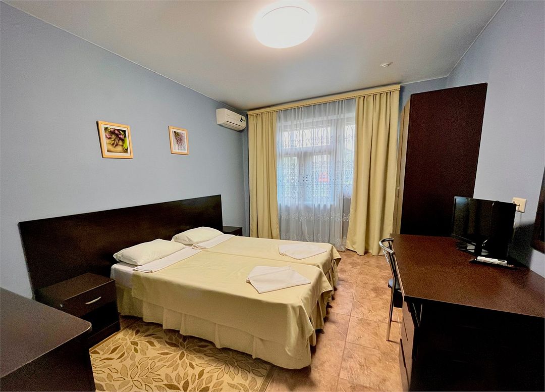 2-комнатный номер с двумя балконами. В раздельных комнатах: два бокс-спринга, шкаф, тумбочки, стол, стулья, телевизор, кондиционер. В холле- холодильник, эл.чайник, столУслуги и удобства