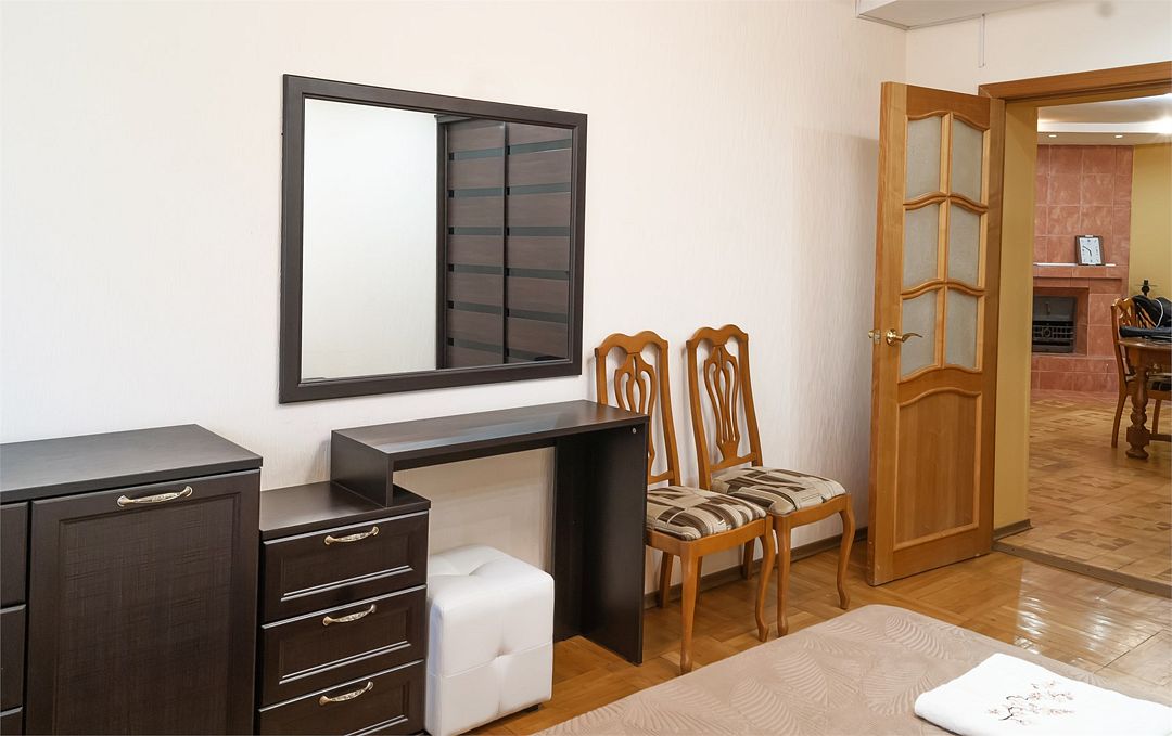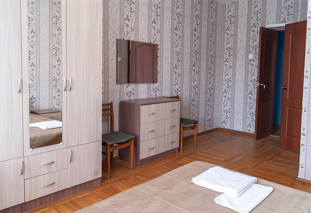 Просторный номер. Гостиная: мягкая мебель, телевизор, журнальный столик, шкаф для одежды, комод, кондиционер. Спальня: большая 2-х спальная кровать, односпальная кровать, тумбочки. Кухонный уголок: стол, стулья, холодильник, эл.чайник.Услуги и удобства
