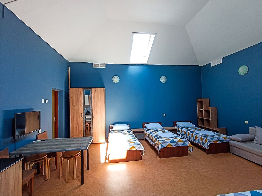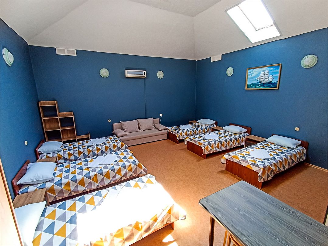 Классический номер мансардного типа: шесть кроватей, тумбочки, вешалка, столик, стулья, эл.чайник, холодильник, кондиционер, телевизор . Cанузел: душ-поддон, унитаз, раковина.Услуги и удобства