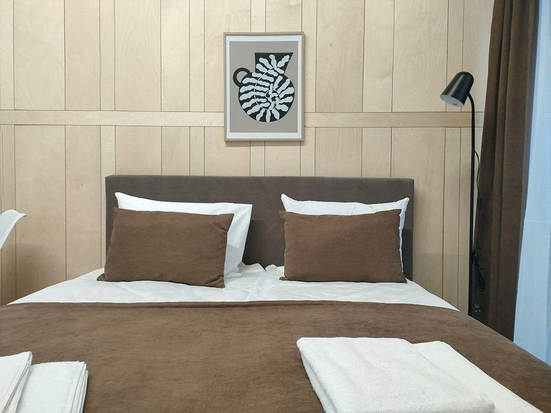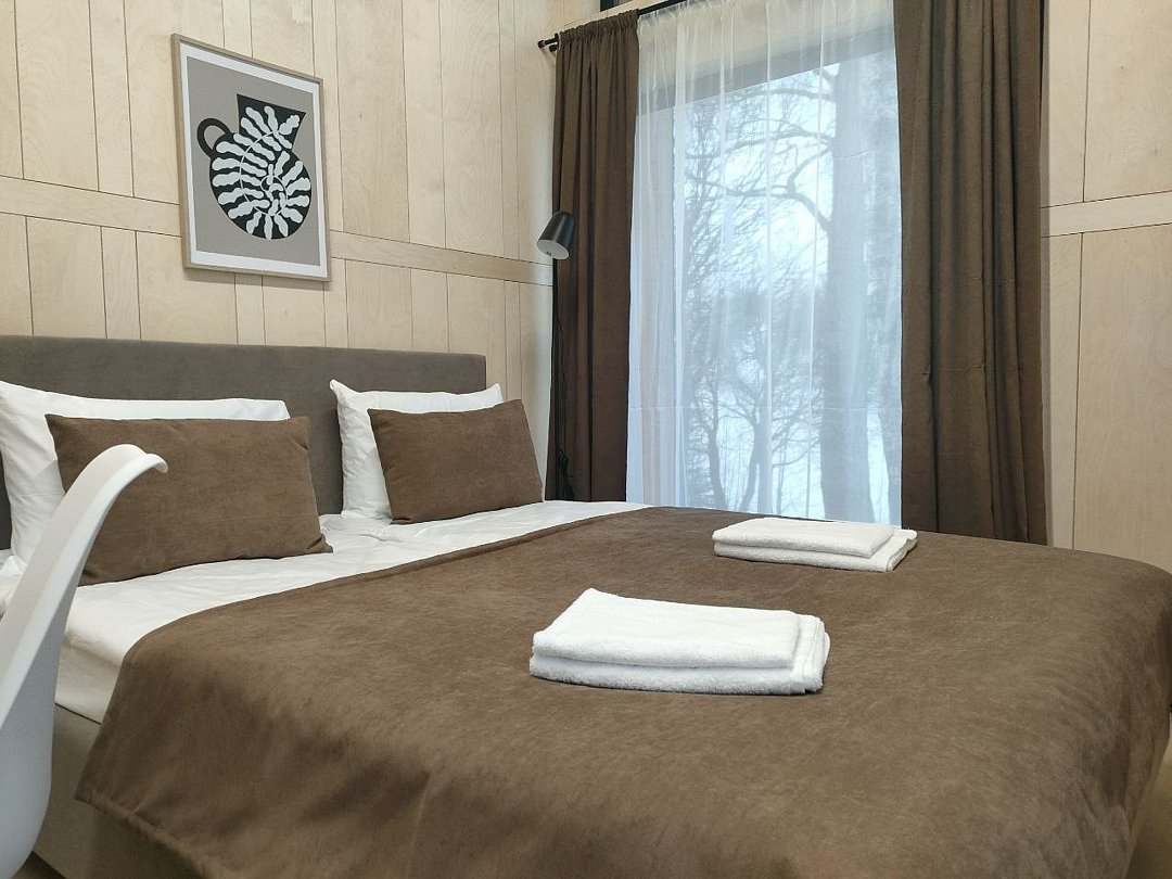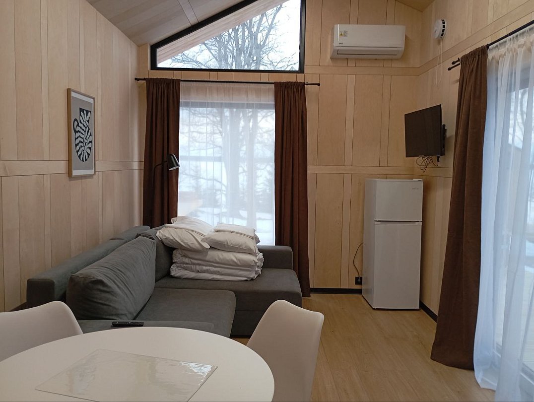 С видом на живописный лес и главную аллею! Огромная терраса с гриль зоной и бочкой-фурако, кухня со всем необходимым, просторная комната с двуспальной кроватью и раскладным диваном.