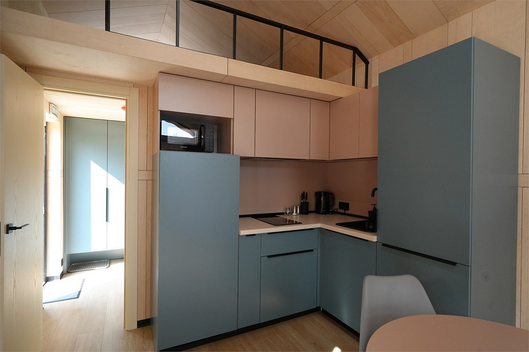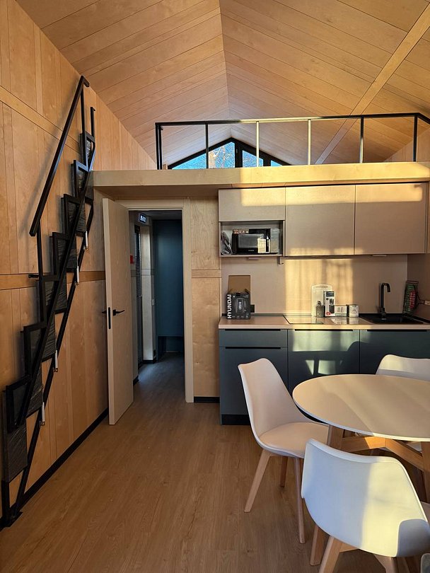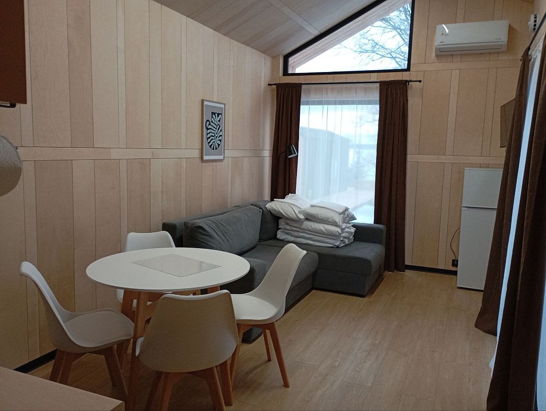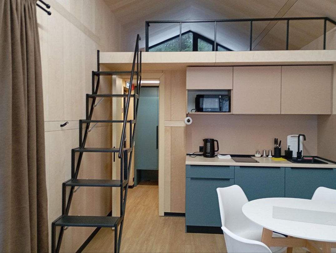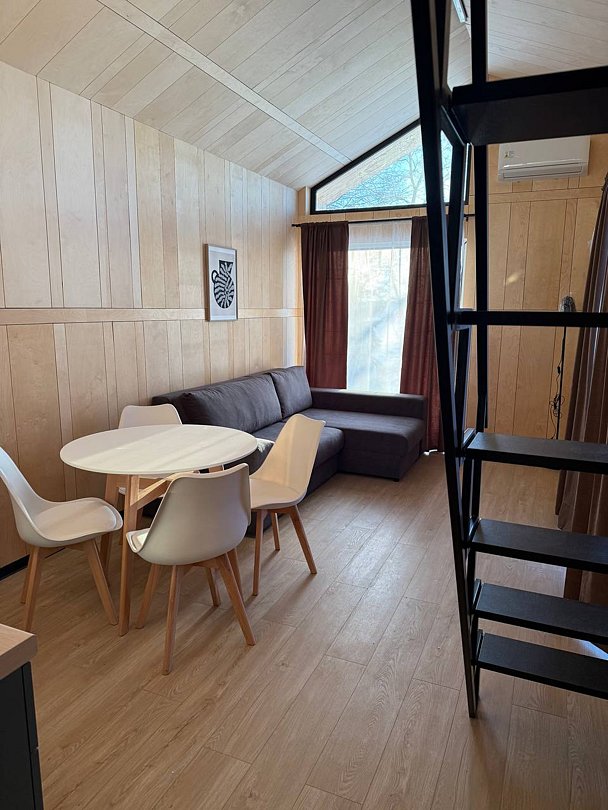 Дом рассчитан на два человека, с возможностью размещения до двух дополнительных гостей.