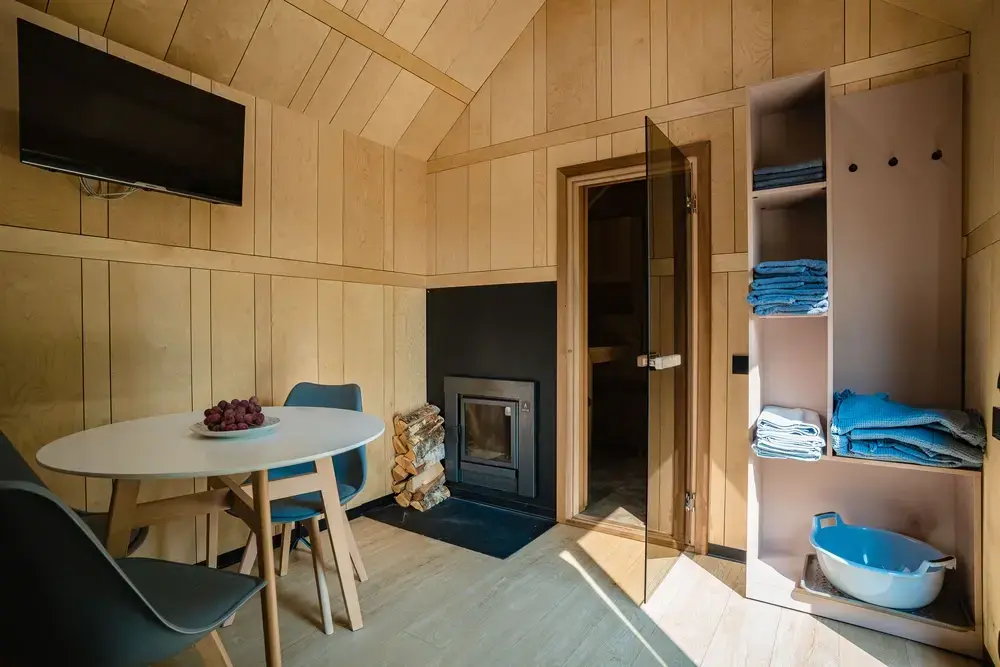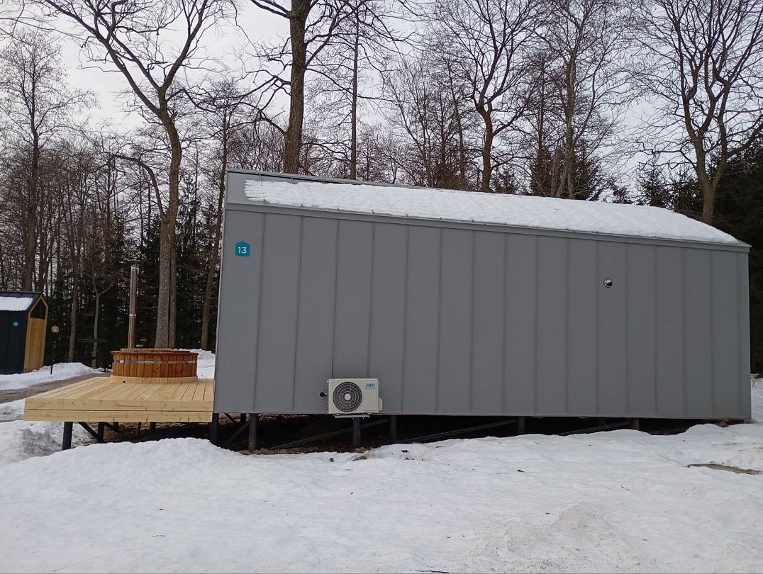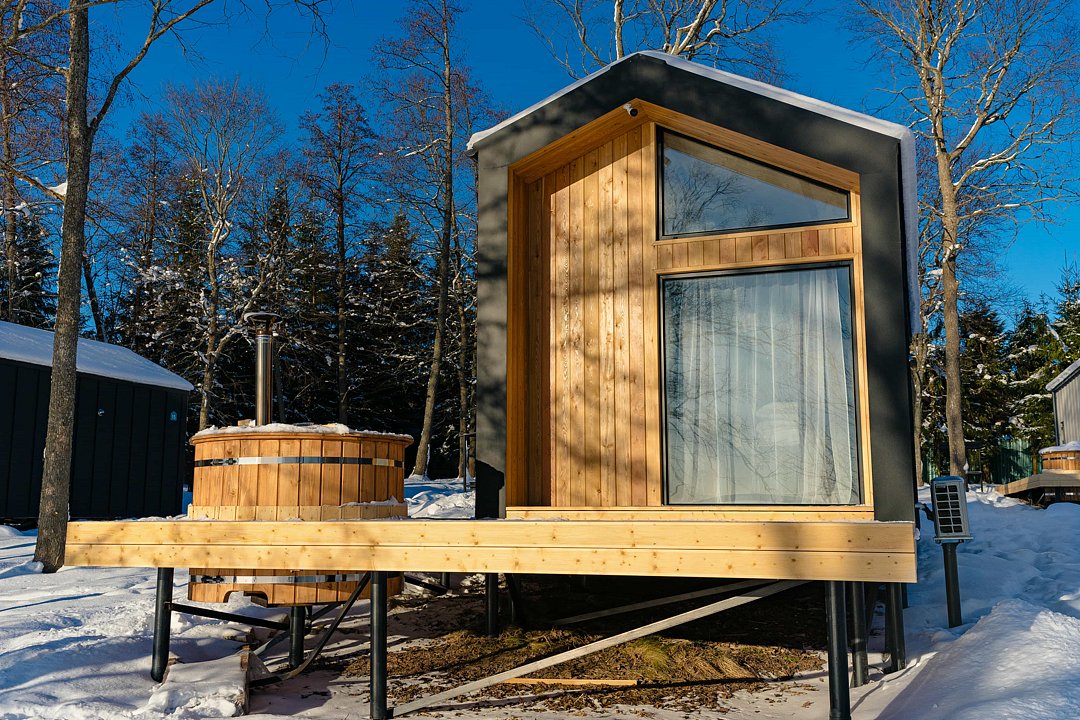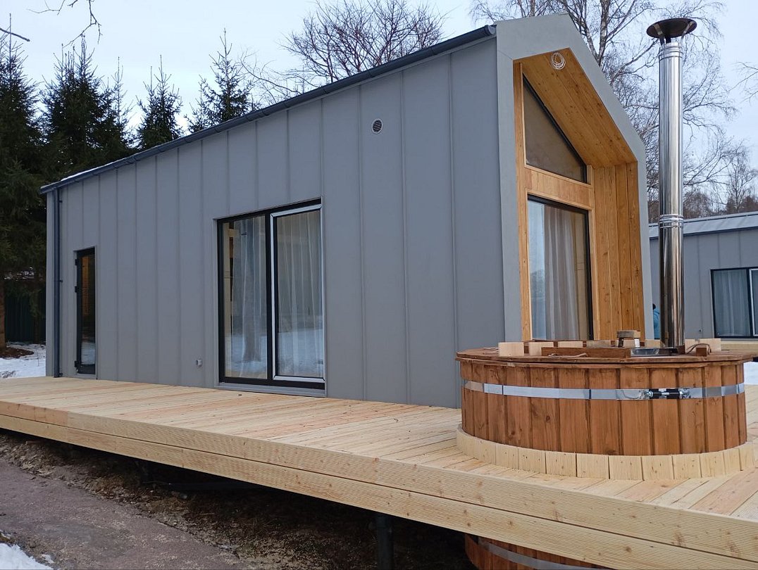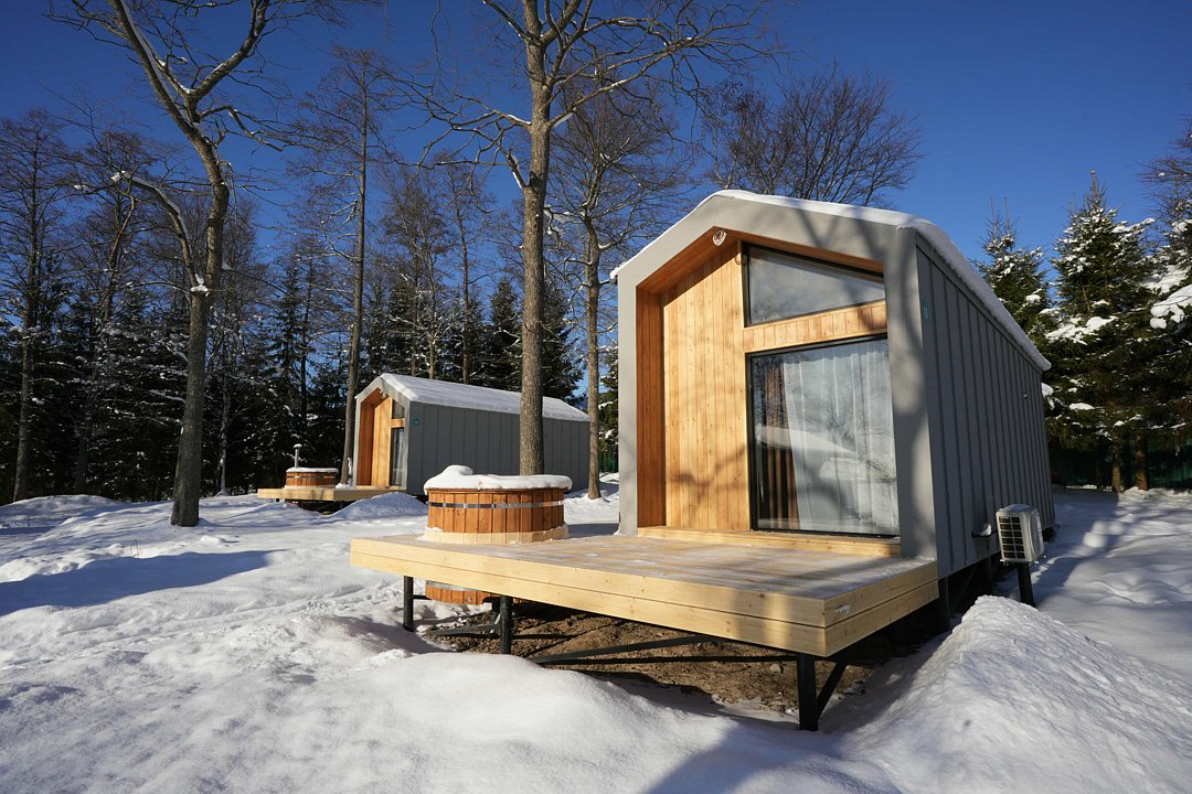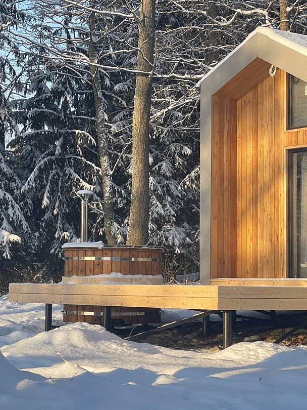 Для комфортного проживания для вас подготовлены стильные и уютные барнхаусы с панорамными окнами. В каждом из них есть оснащенная кухня, ванная комната и собственная купель на террасе. Также имеется телевидение и Wi-Fi.