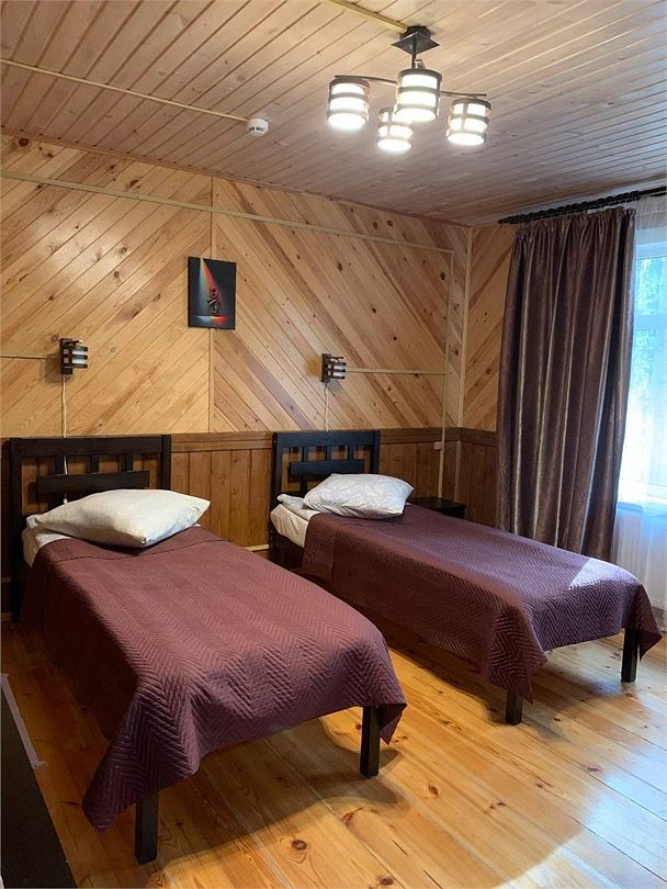 Большие и комфортабельные комнаты для двоих с удобными кроватями, шкафами, комодами, ТВ, возможностью установки дополнительных кроватей, с балконами с видом на озеро или лес.