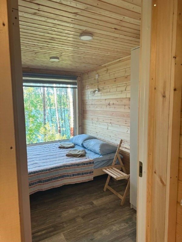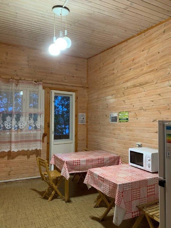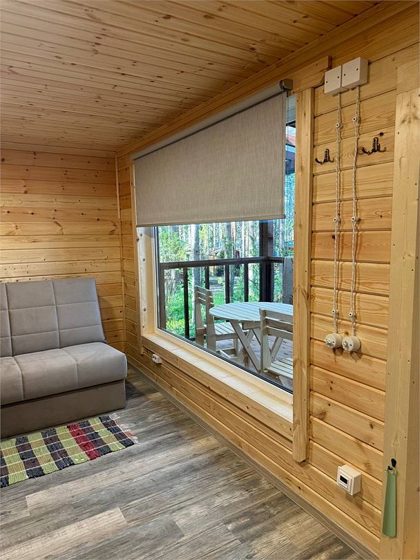 В доме: удобства (душ, туалет), мини-кухня, двуспальная кровать, шкаф, панорамное окно с видом на лес и озеро, раскладной диван, терраса со столиком и креслами. Также для Вас — беседки, мангалы и все дополнительные услуги базы отдыха!