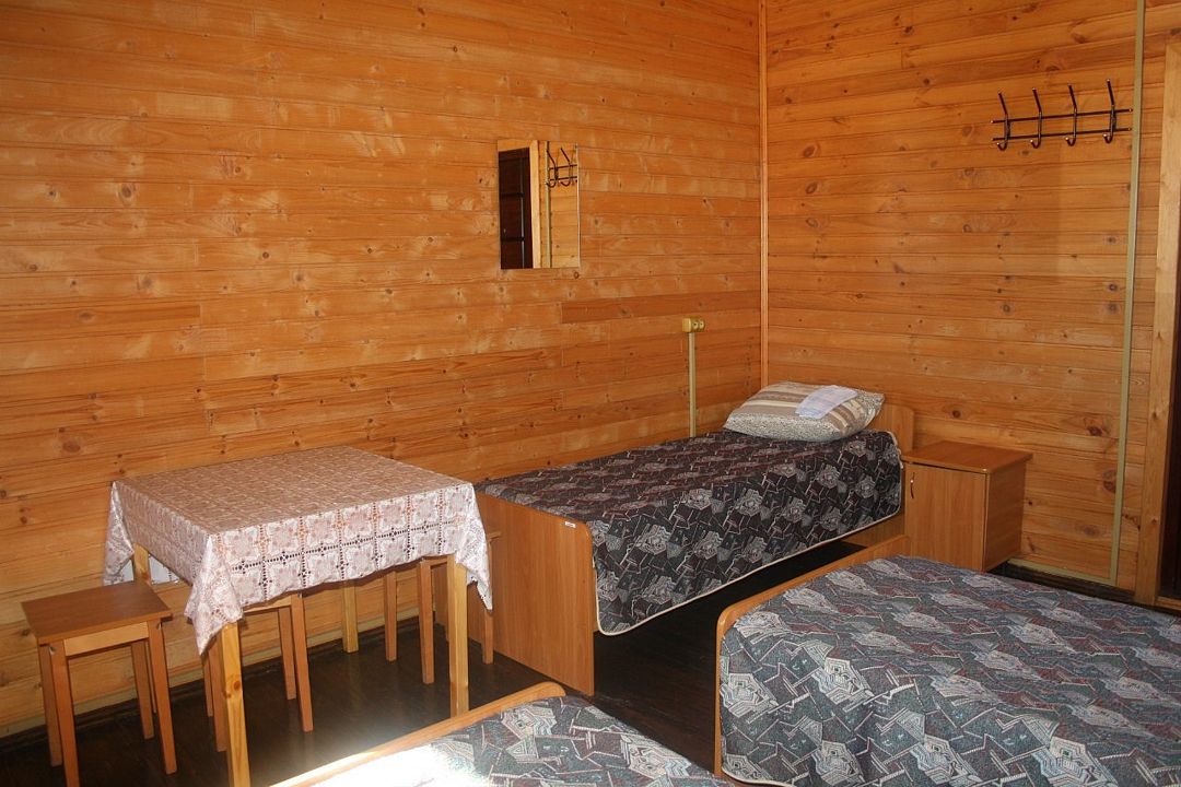 Рядом с корпусом — душевые кабины и туалеты летнего использования — на улице в двадцати метрах. В номере — две односпальные или большая двуспальная кровать.