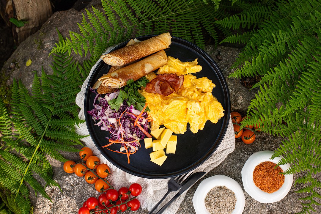 Можно заказать завтрак в нашем Фуд траке. В одной порции завтрака: два румяных блинчика, ломтики Гауды, сочный коул-слоу, нежный скрэмбл на молоке с хрустящим беконом и напиток на выбор — от свежесваренного кофе до ягодного морса.