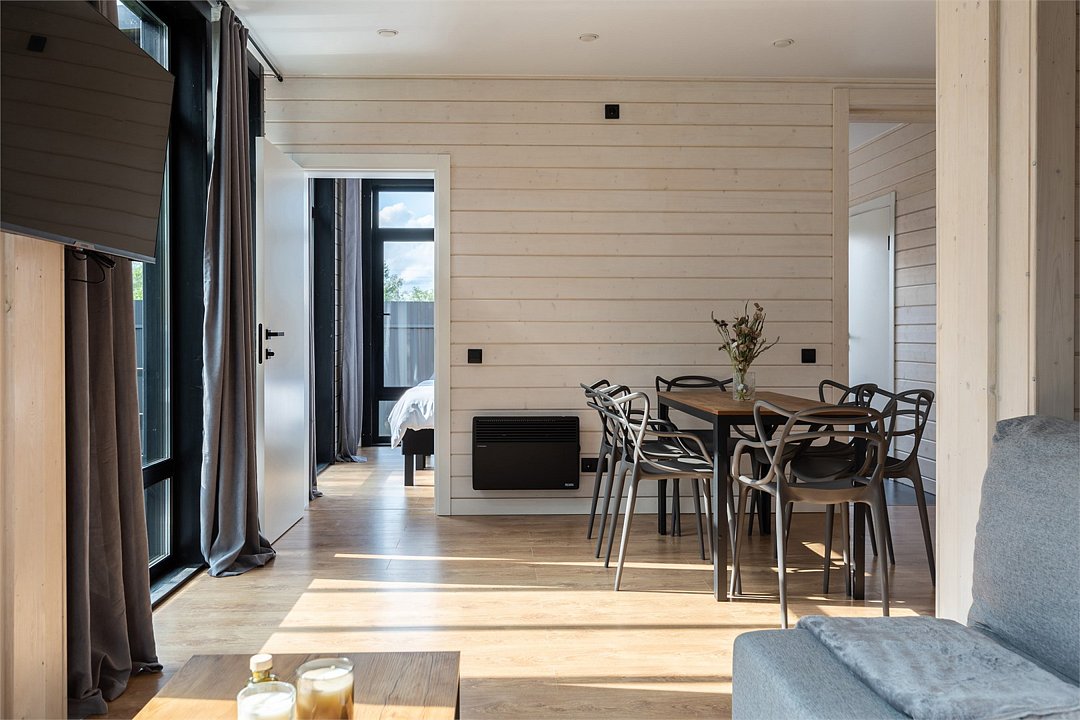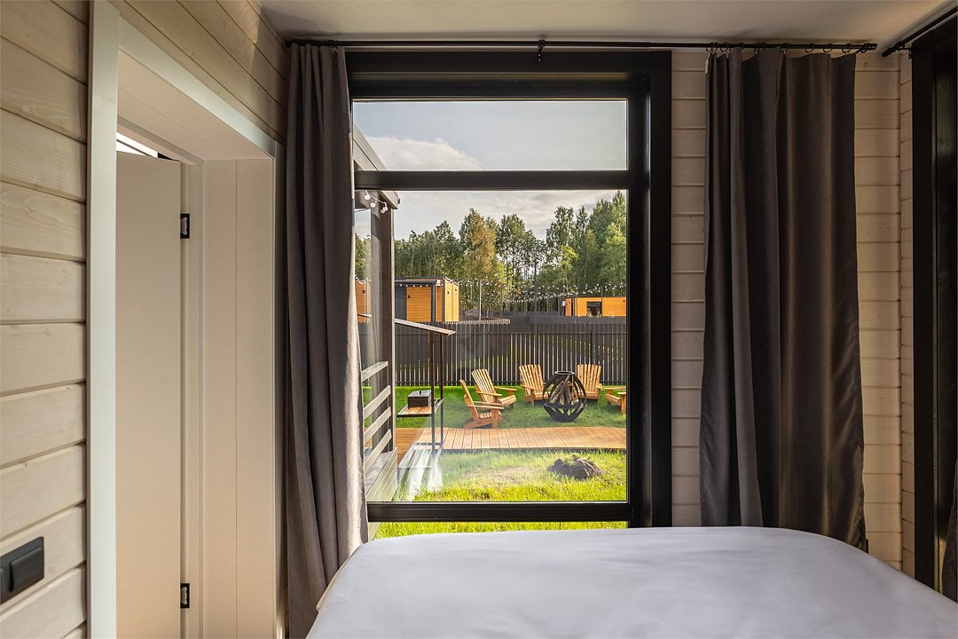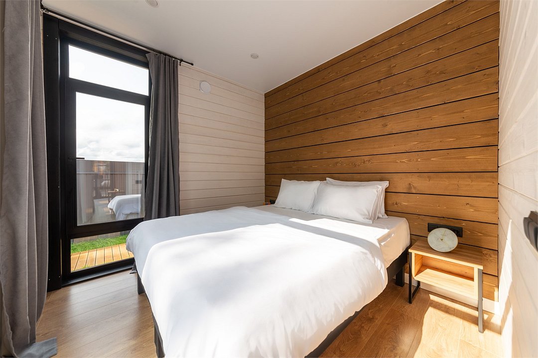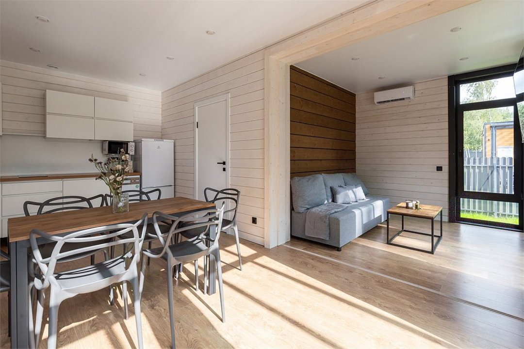 Коттеджи рассчитаны на компанию от 2 до 6 человек и обустроены с заботой о вашем комфорте. В просторной кухне-гостиной есть всё необходимое: холодильник, микроволновая печь, варочная панель и посудомоечная машина, а также полный набор посуды. Дополняют уют панорамные окна, наполняющие дом светом, тёплые полы и телевизор для вечернего досуга.