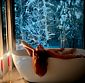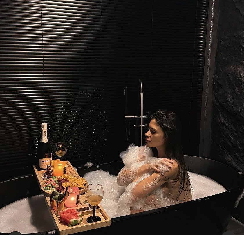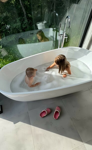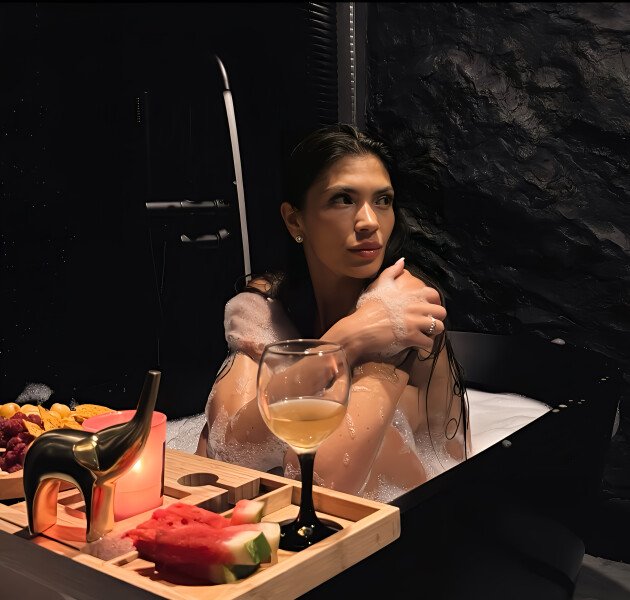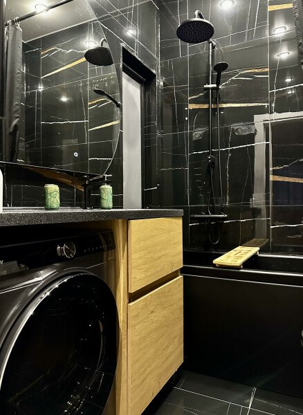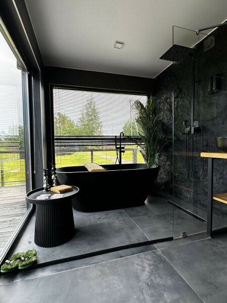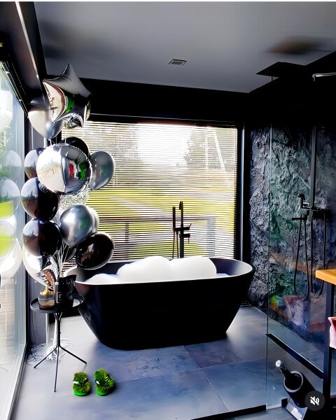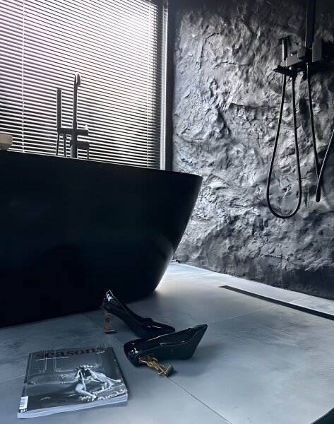 Домик с панорамной отдельно стоящей черной ванной, тропическим душем и гавайской черной скалой из арт бетона, над которой работала художник Анна В.