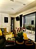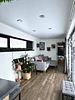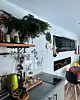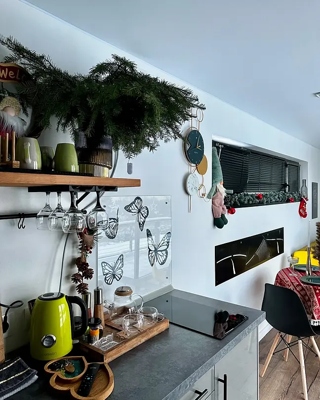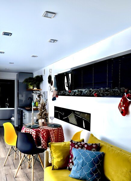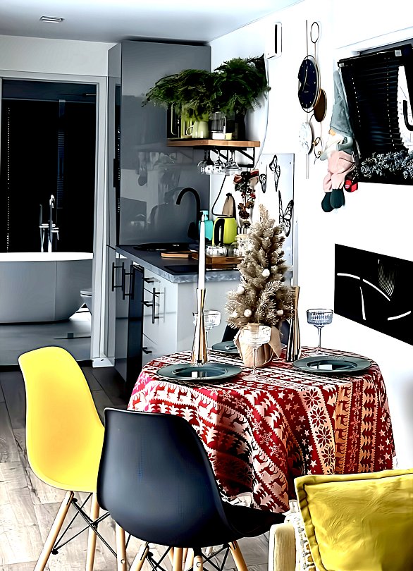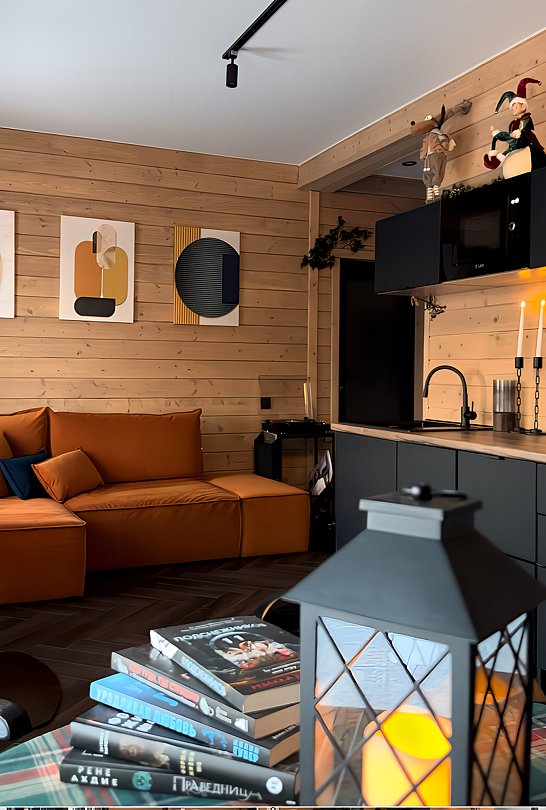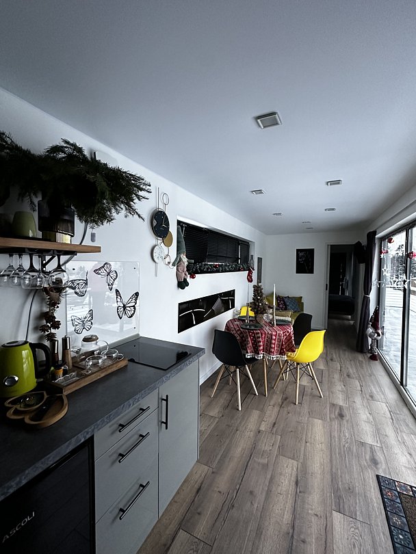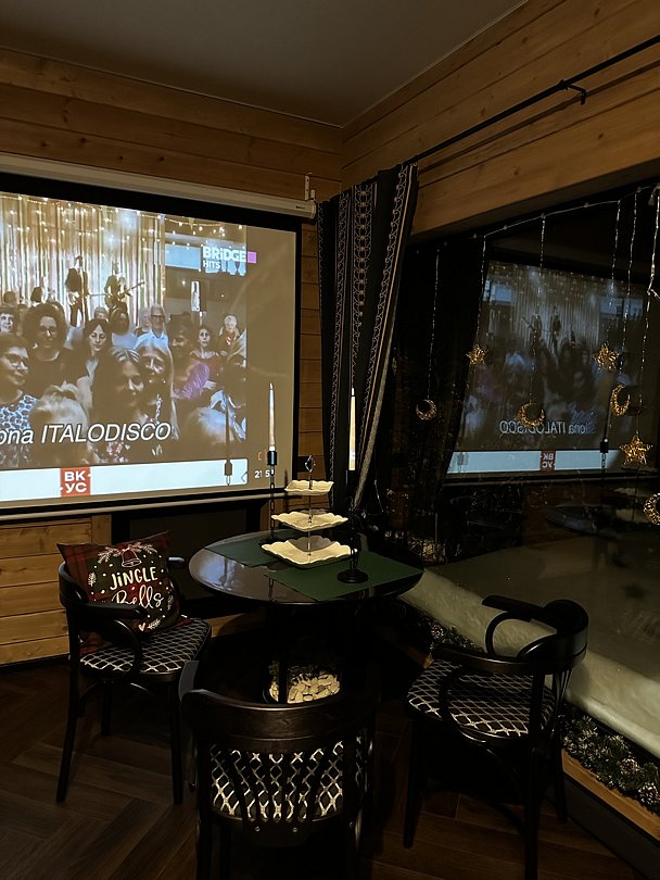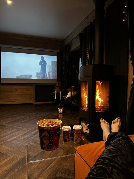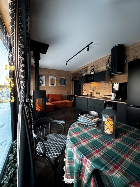 - кухня гостиная: камин с панорамным стеклом, посуда на 4 персоны, плита, духовой шкаф, холодильник, микроволновая печь, посудомоечная машина и стиральная, чайник, экран с электроприводом и проектором, раскладной диван.