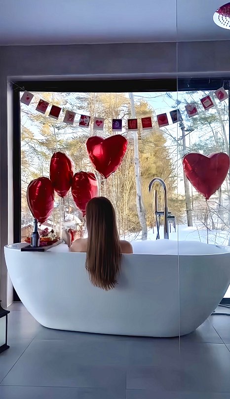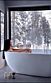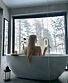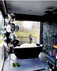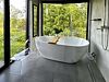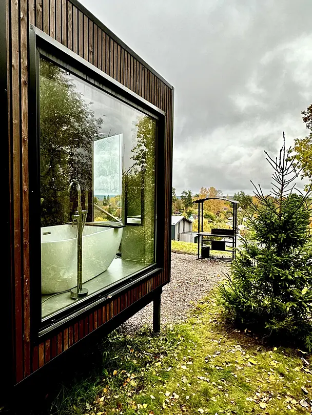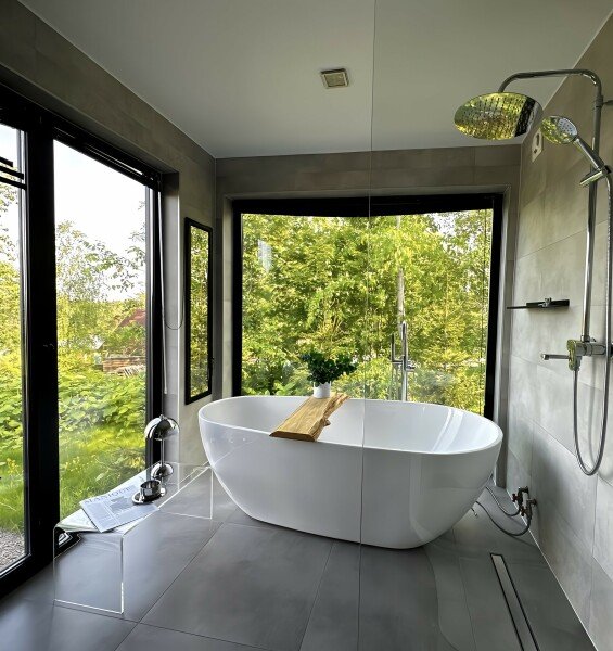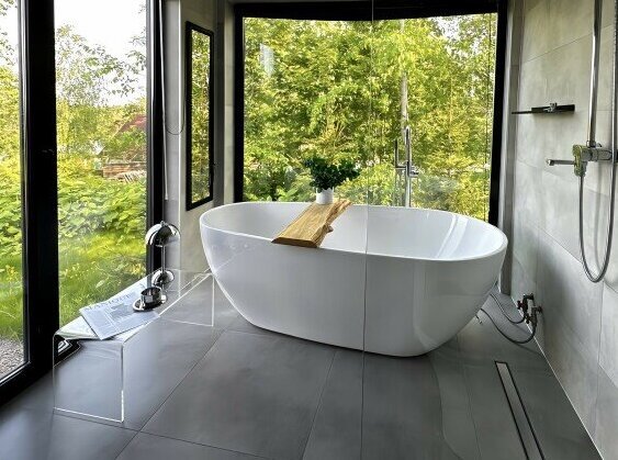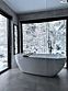 Домик с панорамной ванной комнатой исполненной в светло-серых тонах в стиле лофт бетон.
