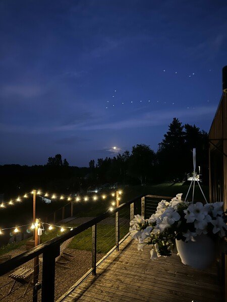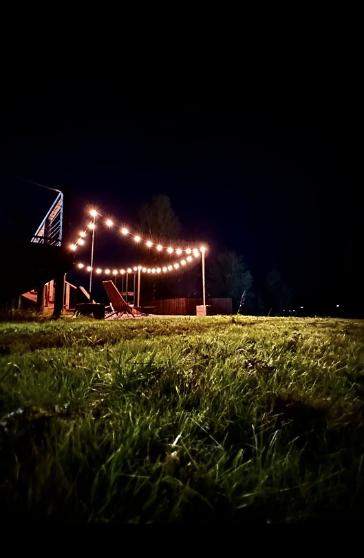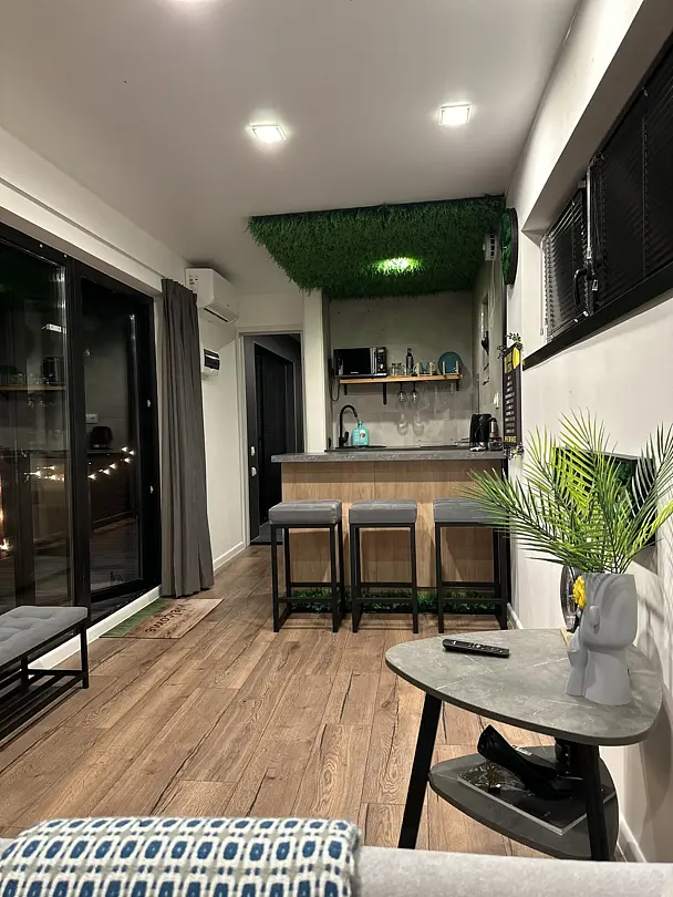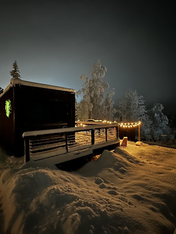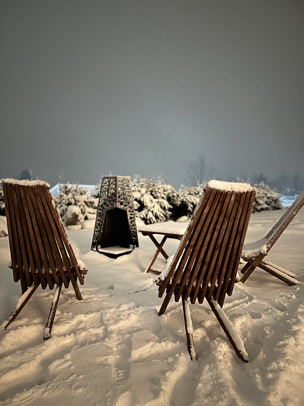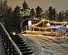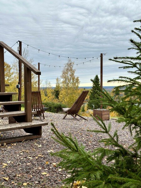 У домика имеется своя собственная терраса, мангальная зона (патио) с шезлонгами, костровой чашей для любителей погреться у костра и подсветкой из лофт гирлянды для более романтичного времяпровождения.