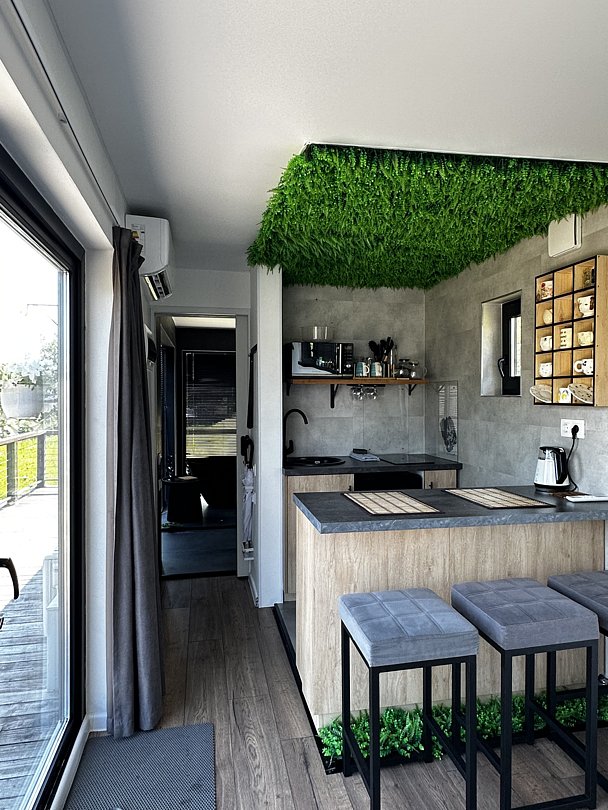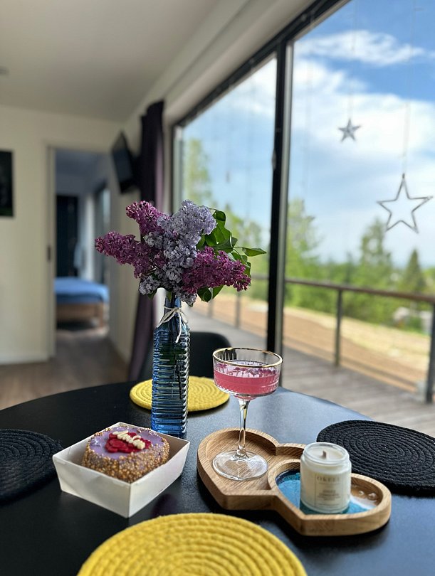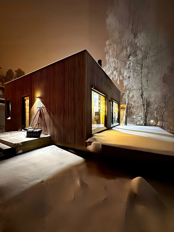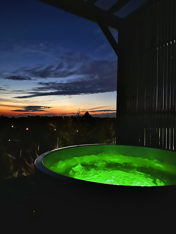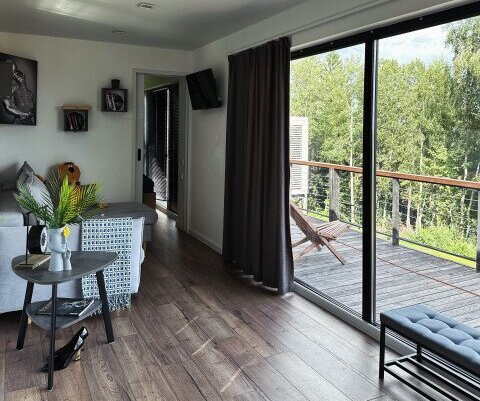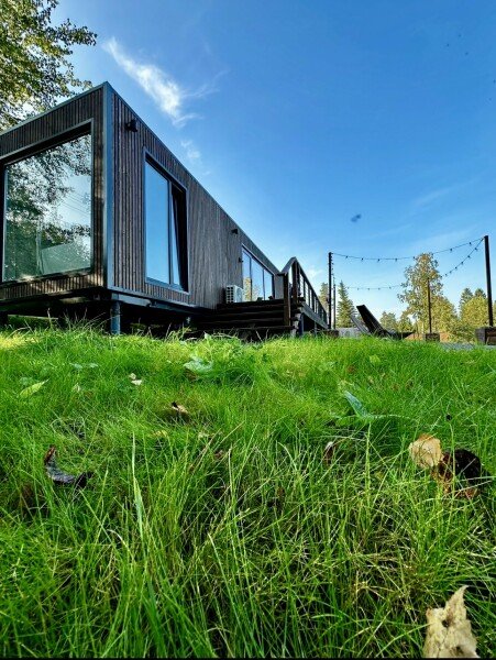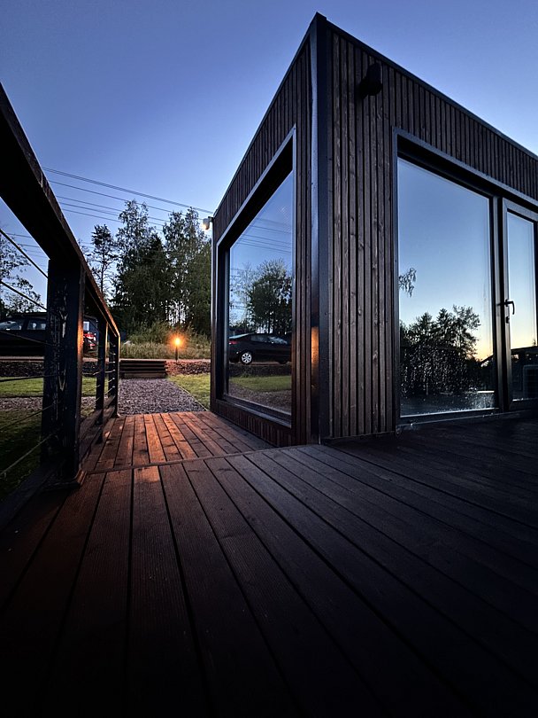 Для проживания гостей на территории подготовлено три коттеджа, каждый из которых — это продуманное пространство для уединения и перезагрузки. Стильные интерьеры, естественные материалы, мягкий свет, панорамные окна с видом на сосновый лес, современная ванна — всё это создано для вашего комфорта. У каждого домика имеется собственная терраса с мангальной зоной, шезлонгами и костровой чашей. Все домики оснащены центральным отоплением, бойлерами, а также кухней, оборудованной бытовой техникой и набором посуды. Бесперебойный скоростной интернет в каждом коттедже.
