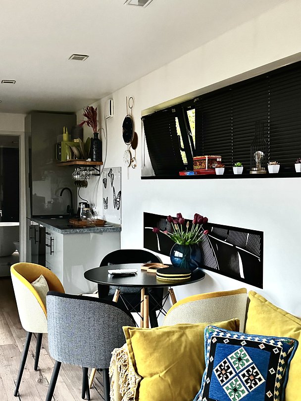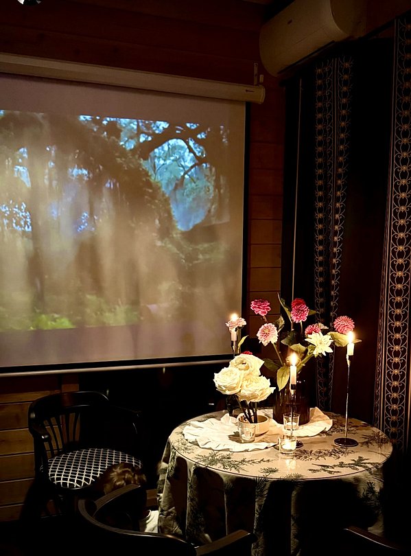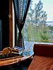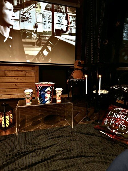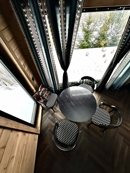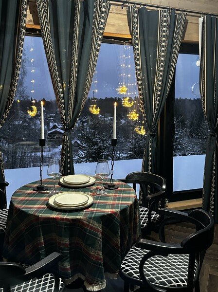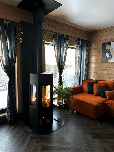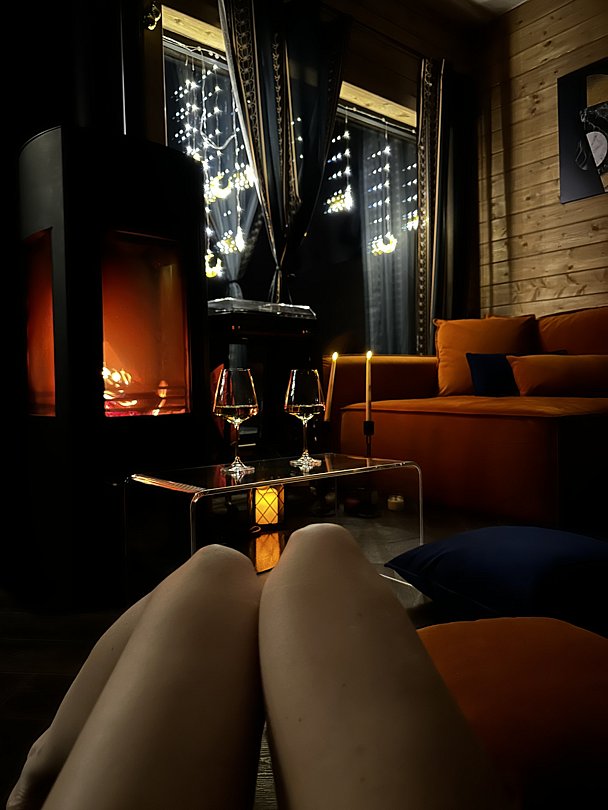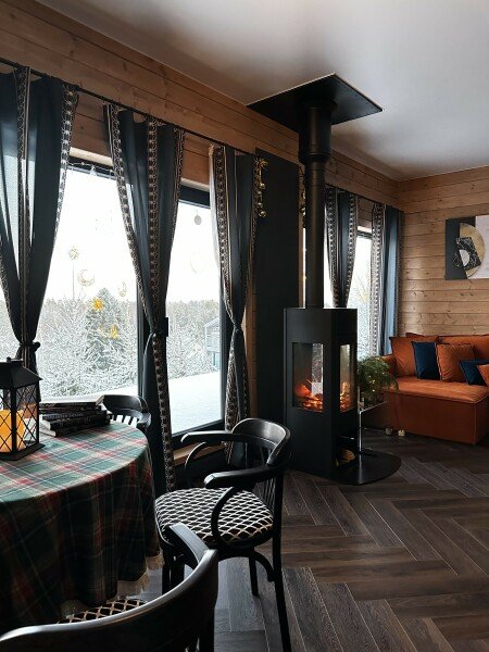 Домик с панорамными окнами, стеклянным камином и проектором.