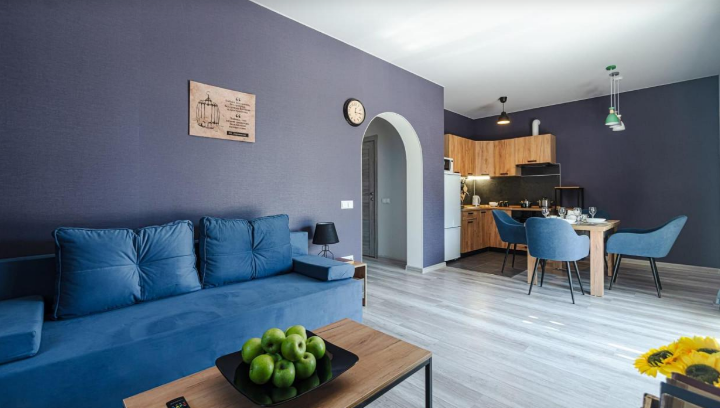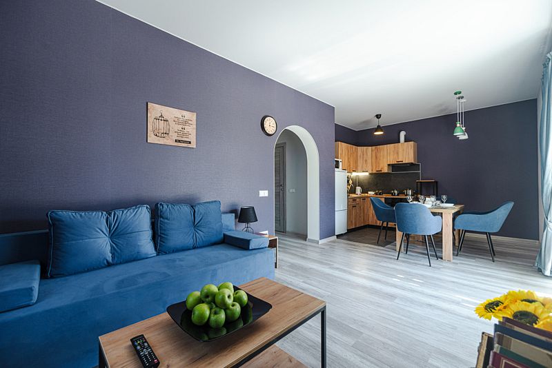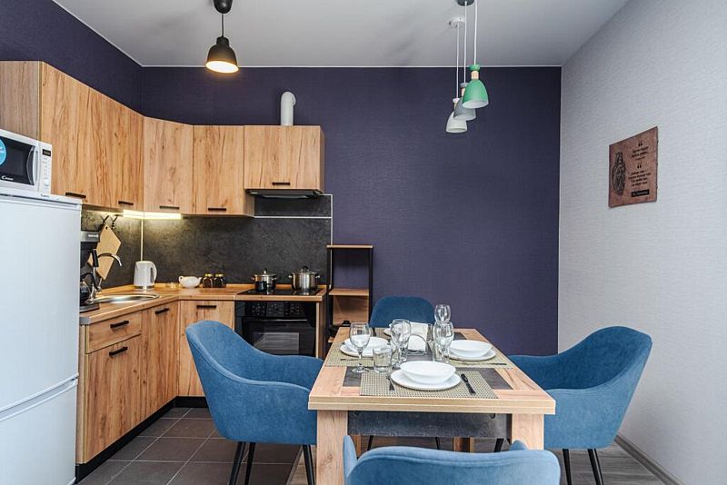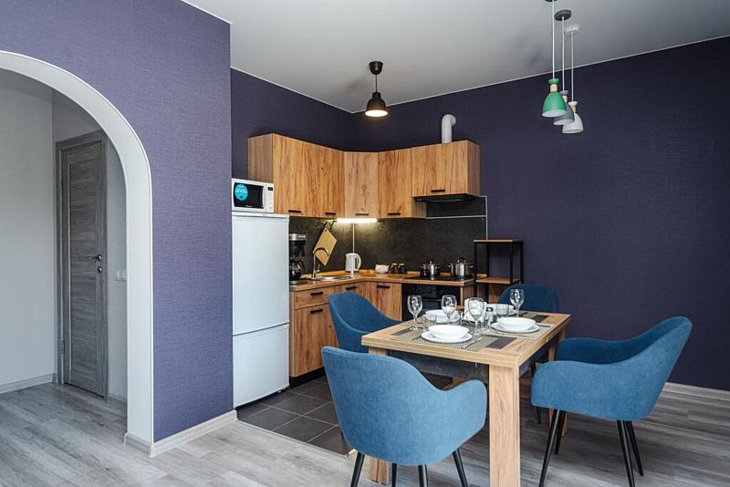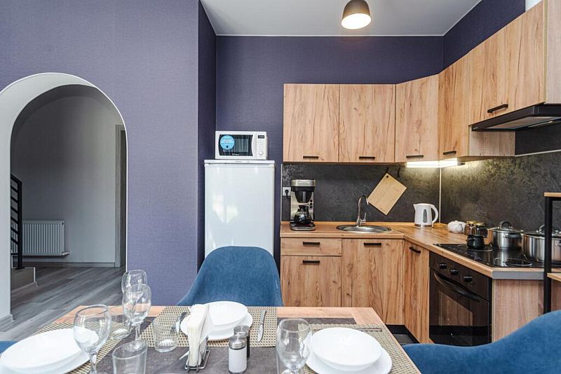 Кухня полностью оборудована для самостоятельной готовки. Имеется плита, духовка, холодильник, микроволновая печь и набор посуды. Также есть возможность заказать вкусные завтраки.