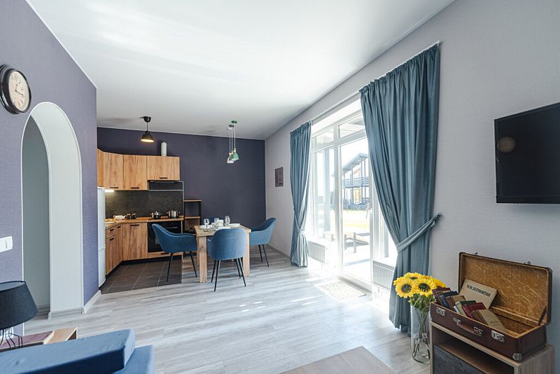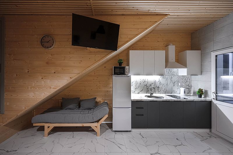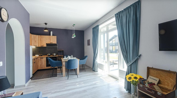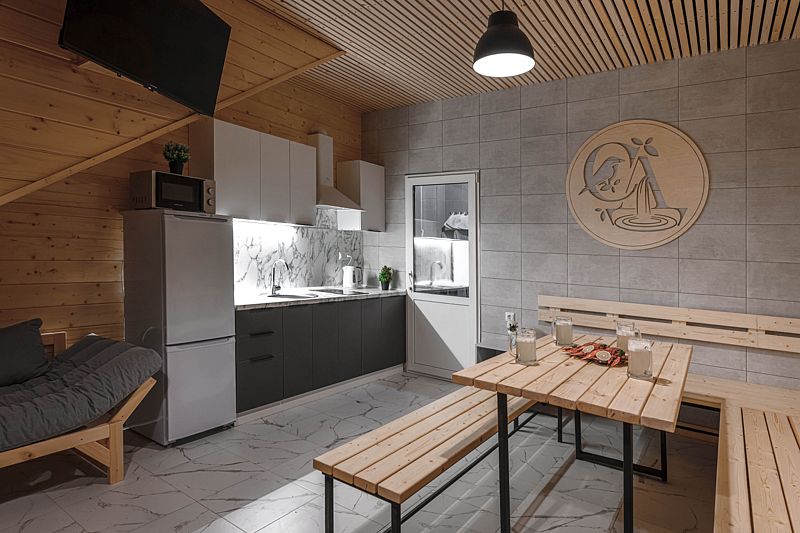 Все дома имеют следующее наполнение: кухня с четырехкомфорочной плитой, духовкой, холодильником, микроволновкой, чайником и всей необходимой посудой.
