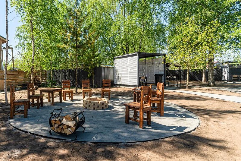 Отдохнуть на свежем воздухе можно в уютных беседках у мангальной зоны, имеется детская площадка, настольный теннис, батут и прокат велосипедов. А в 200 м протекает река Тосна.