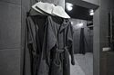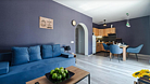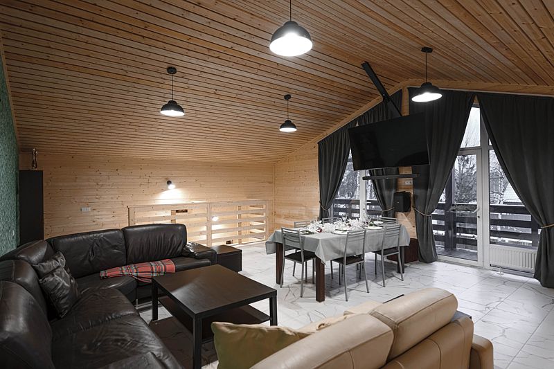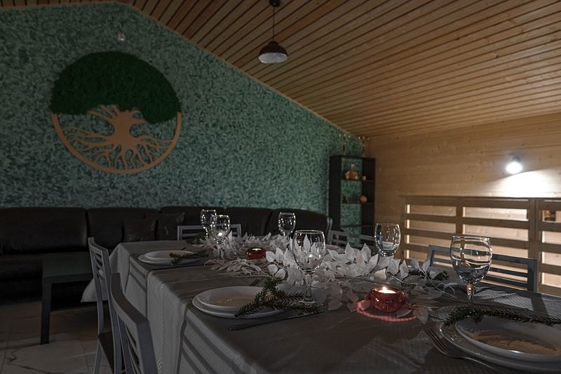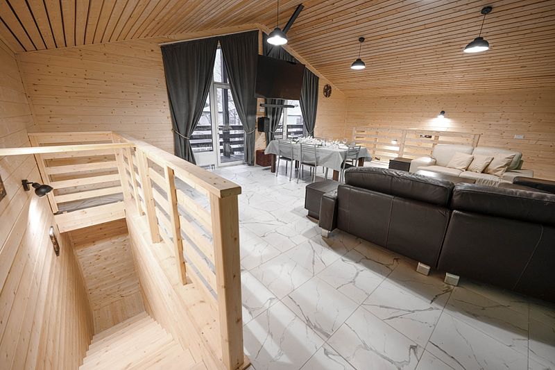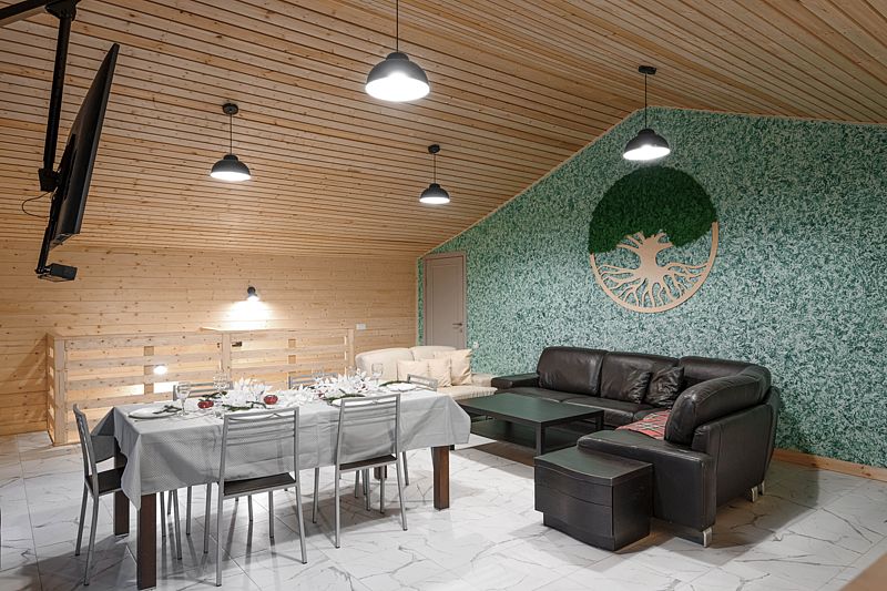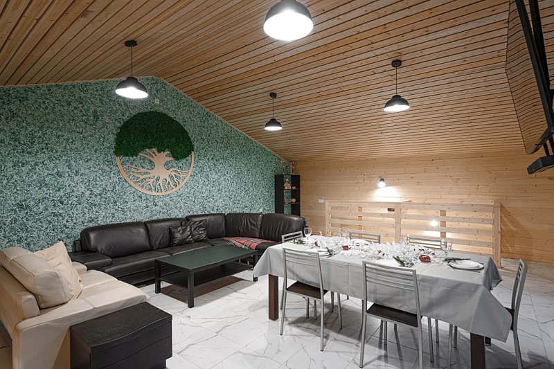 Большая гостиная площадью 50 кв.м обустроена для проведения торжеств и релакса с двумя удобными диванами, обеденным столом для большой компании, 80/дм. телевизором, саунд баром, просторным балконом, а так же лестницей, ведущей на первый этаж в спа-зону.